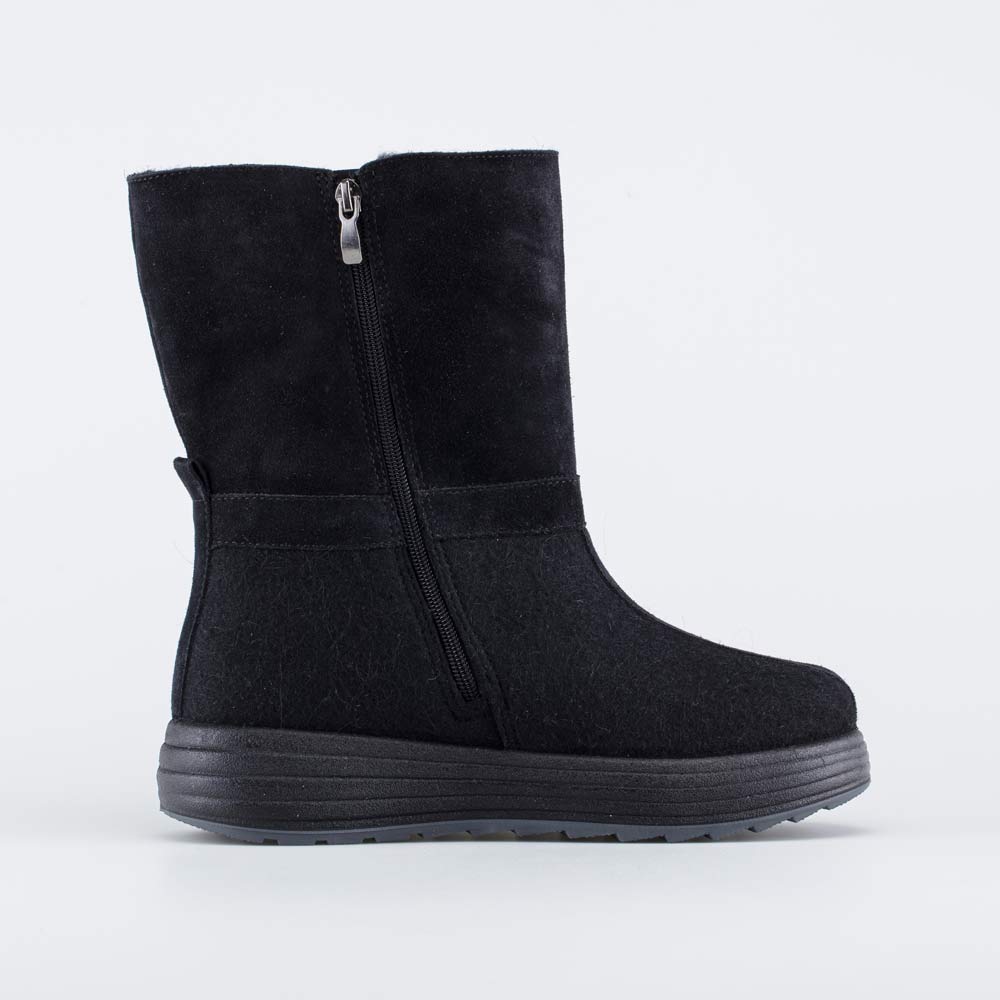 Черные валенки серии Арктик имеют увеличенную толщину стельки и выделяются среди других наивысшими теплозащитными качествами. Голенище средней высоты позволяет легко сочетать модель с брюками и длинными платьями.