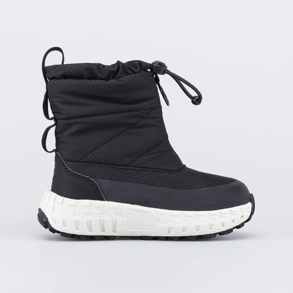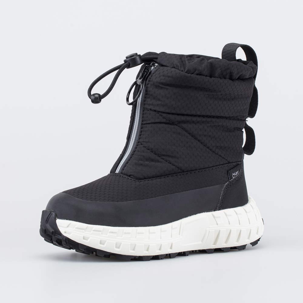 Верх этих черных сапожек изготовлен из легкого в уходе и ветронепродуваемого текстиля. По периметру вдоль подошвы он продублирован искусственной кожей. Пяточная часть защищена антивандальной накладкой с ПУ-покрытием.