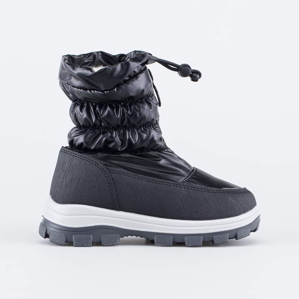 Молния, расположенная спереди, позволяет быстро обувать и разувать ребенка, а шнурок с утяжкой предотвращает попадание внутрь влаги или снега.