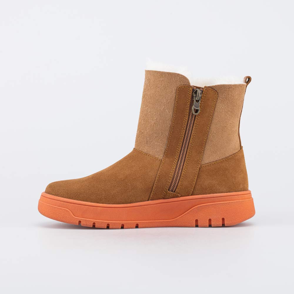 Зимние сапожки кирпичного цвета выполнены с применением технологии дабл-фейс (в районе голенища), когда натуральная овчина поворачивается мехом внутрь, к ножкам, кожей – наружу.