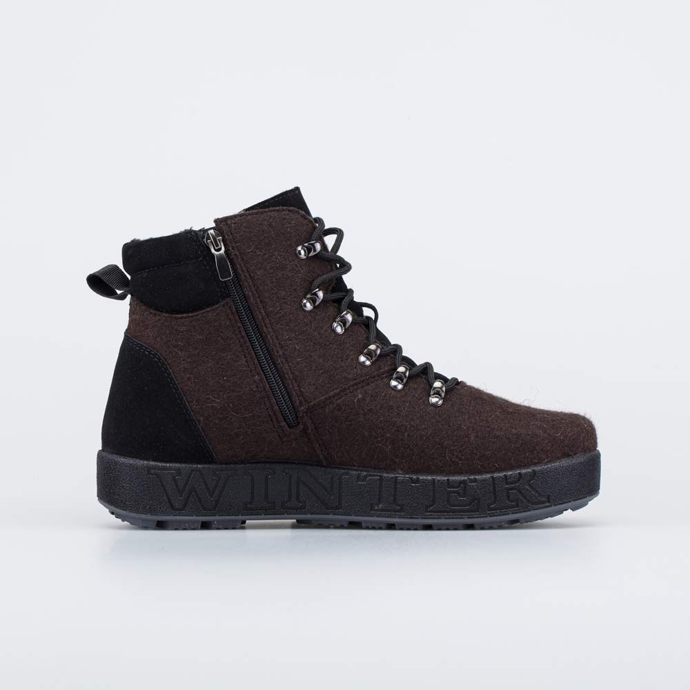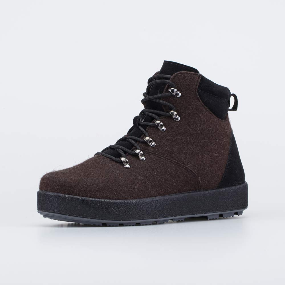 Удобные короткие валенки, стилизованные под войлочные ботинки, гармонично дополняют зимний гардероб современного мужчины. Глубокий коричневый цвет войлока эффектно подчеркнут классическими черными акцентами.