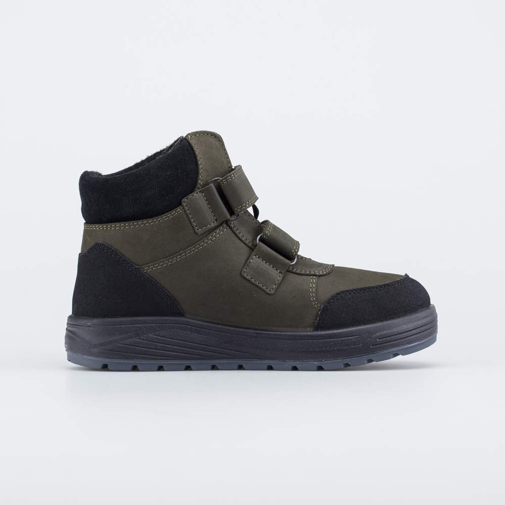 Верх выполнен из натурального нубука оливкового цвета и дополнен черным велюровым манжетом.