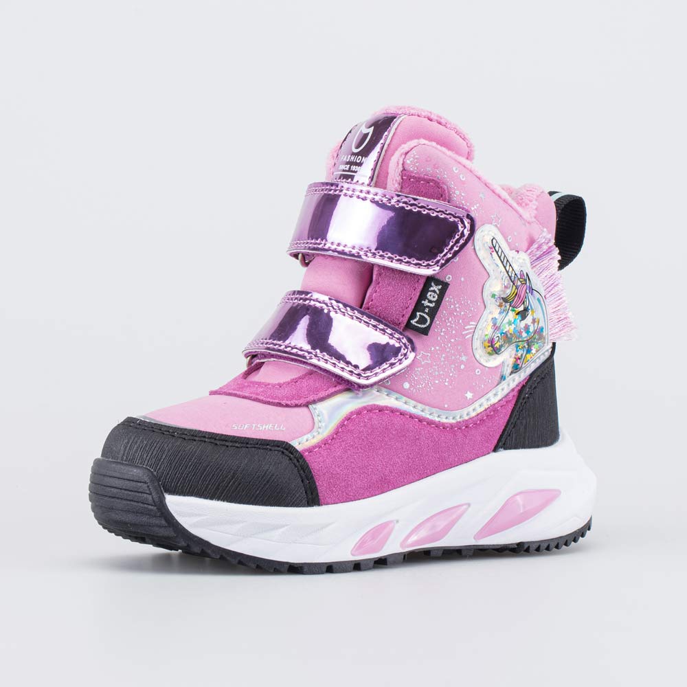 Светящиеся мембранные ботинки, декорированные накладкой в виде единорога с глиттером, выполнены с применением технологии софтшелл.