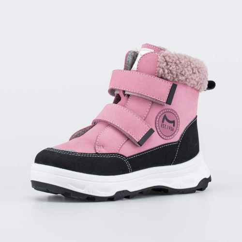 Верх детских ботинок выполнен из натуральной кожи-нубука розового цвета. По всему периметру вдоль подошвы модель защищена дополнительной кожаной накладкой с полиуретановым покрытием.