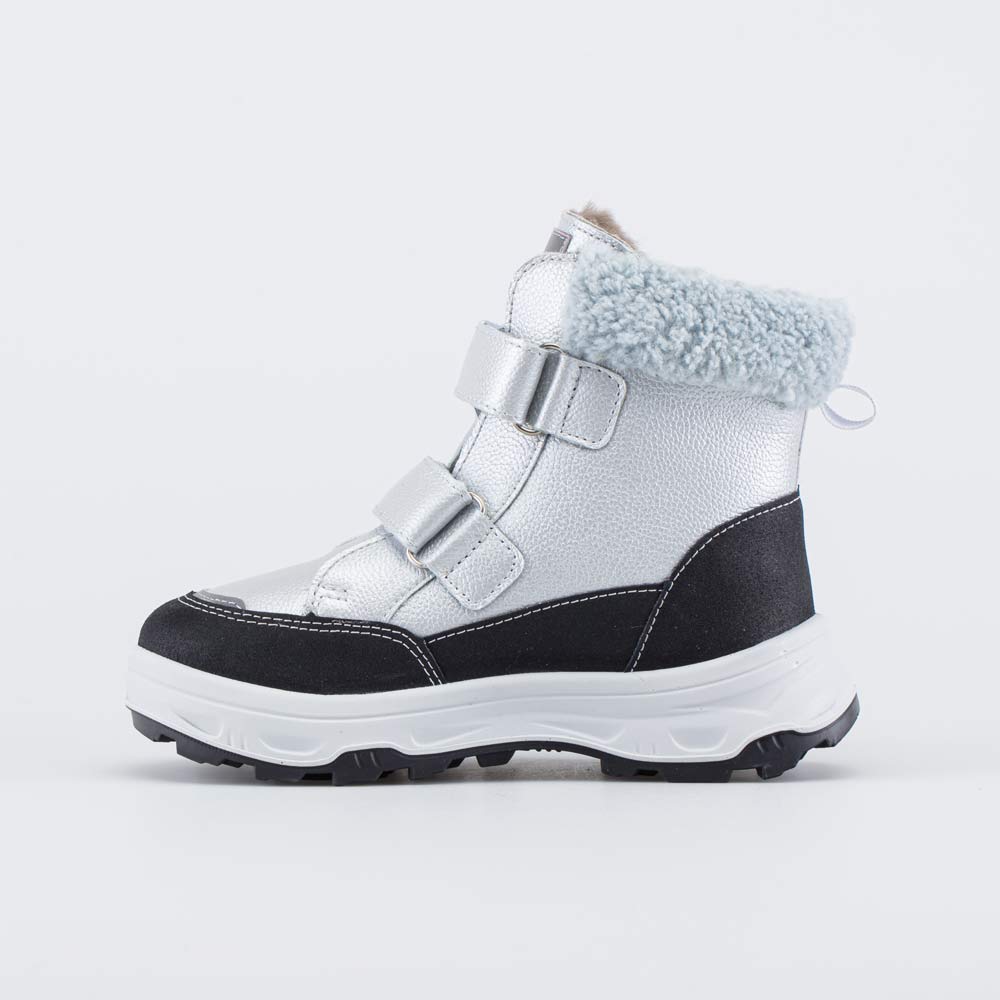 Верх выполнен из натуральной гладкой кожи серебристого цвета. По всему периметру модель защищена дополнительной кожаной накладкой с полиуретановым покрытием.