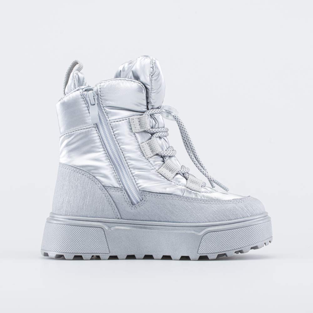 Зимние дутики серебристого цвета, выполненные в стиле ботинок, подходят для девочки-подростка.