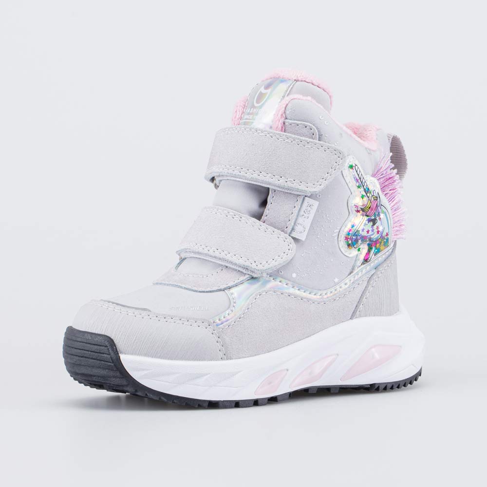 Светящиеся мембранные ботинки, декорированные накладкой в виде единорога с глиттером, выполнены с применением технологии софтшелл.