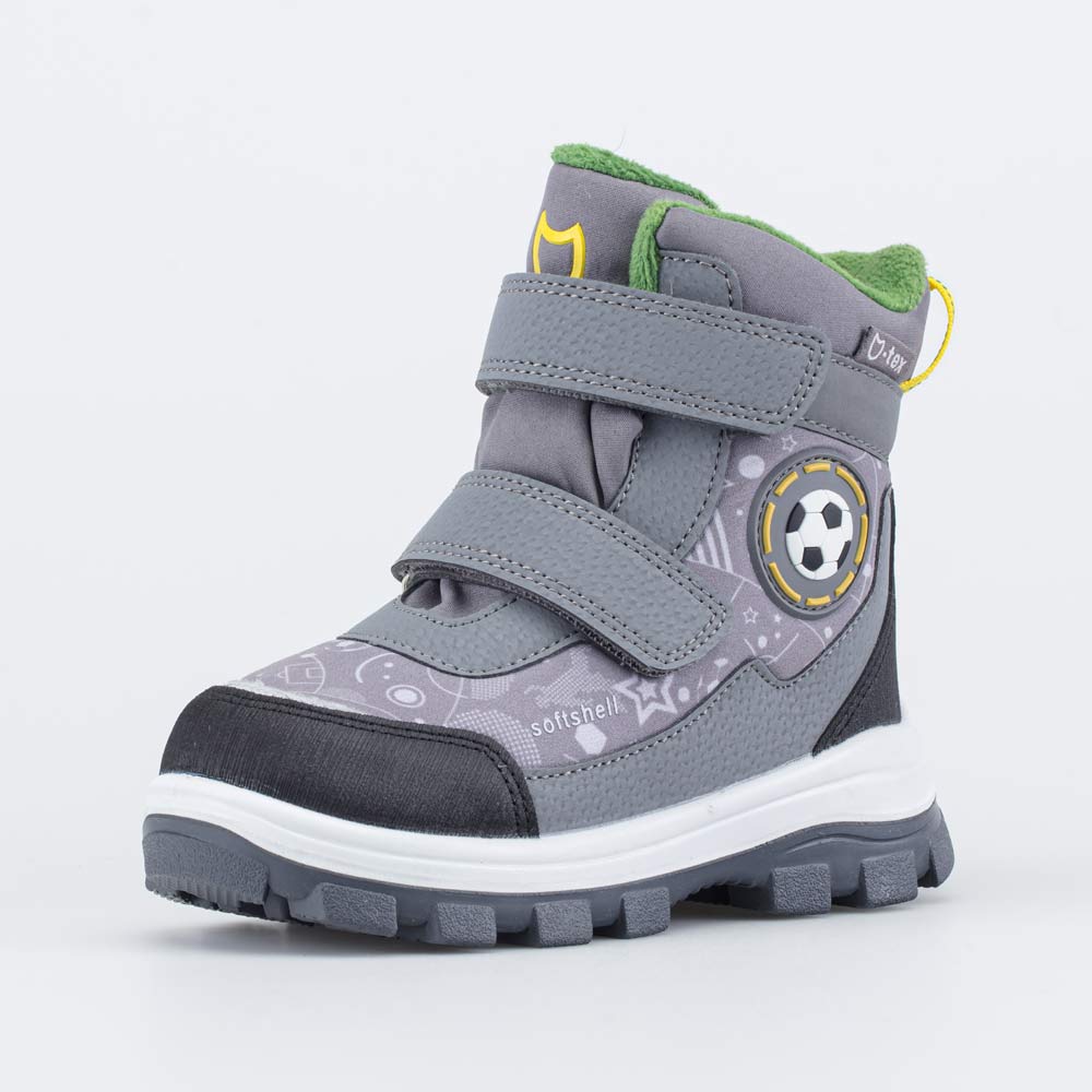 Мембранные ботинки серого цвета для мальчика ясельного возраста выполнены с применением технологии SoftShell.