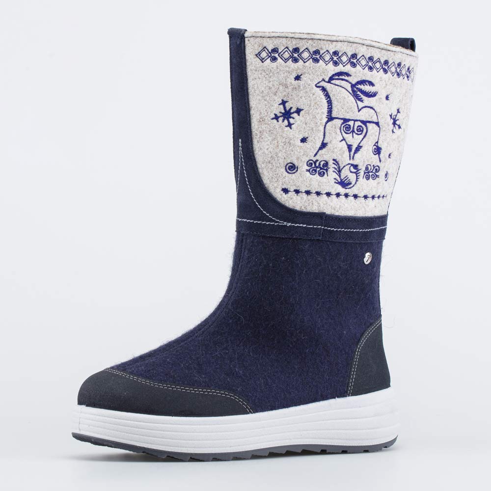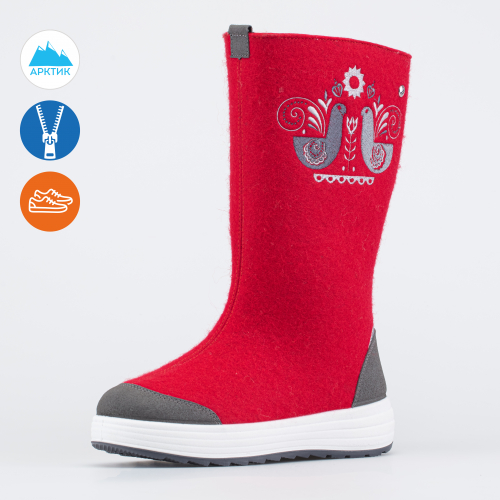 Плотный войлок надежно сохраняет тепло, обладает влагоотталкивающими свойствами, дышит и создаёт приятный микроклимат вокруг стопы. Носок и пятка защищены от влаги и реагентов кожаными накладками с ПУ-покрытием, а вышивка на голенище наделяет модель особым колоритом.
