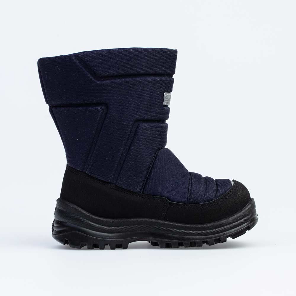 Синие сапожки-дутики для детей школьного возраста изготовлены из комбинации натуральной кожи и текстильного материала.