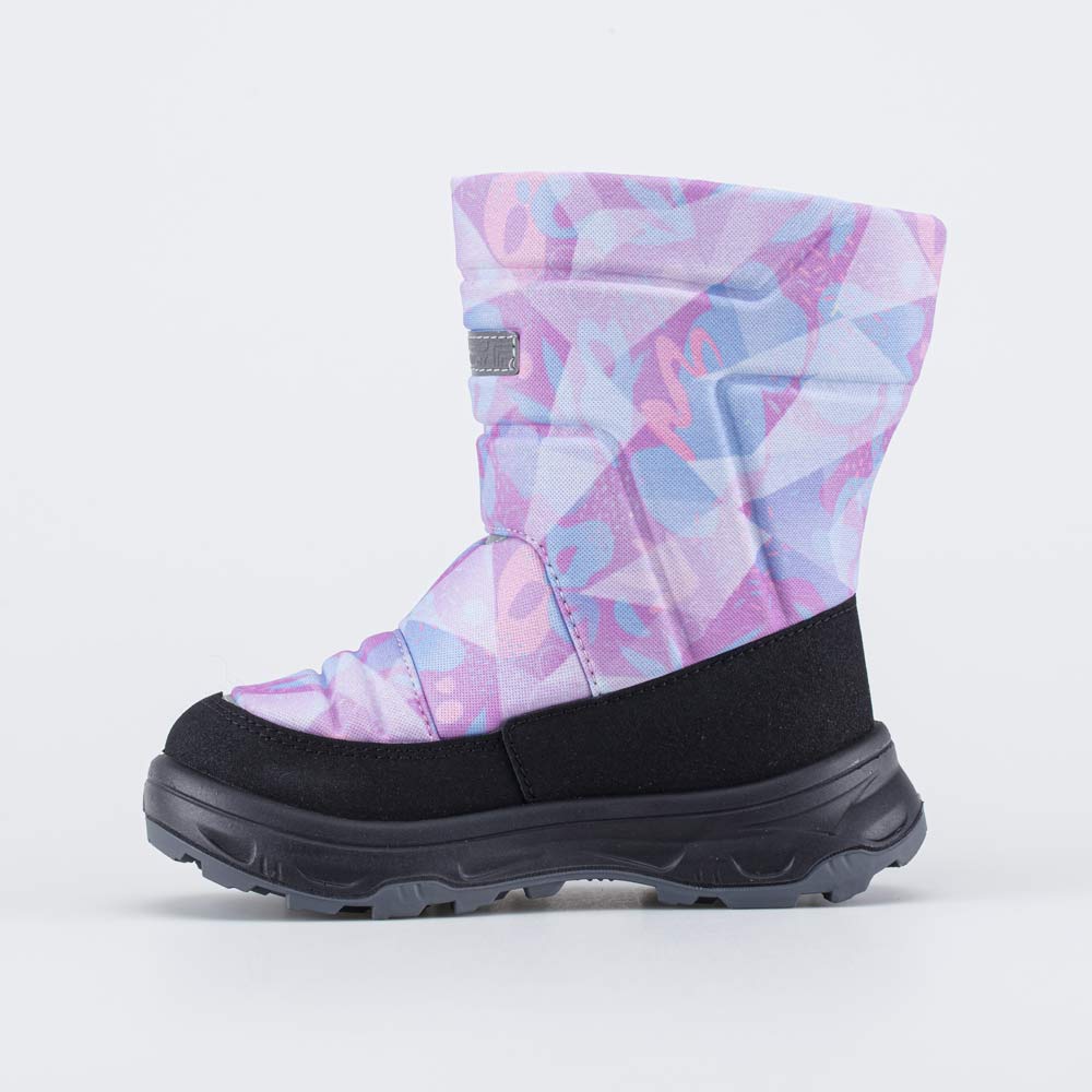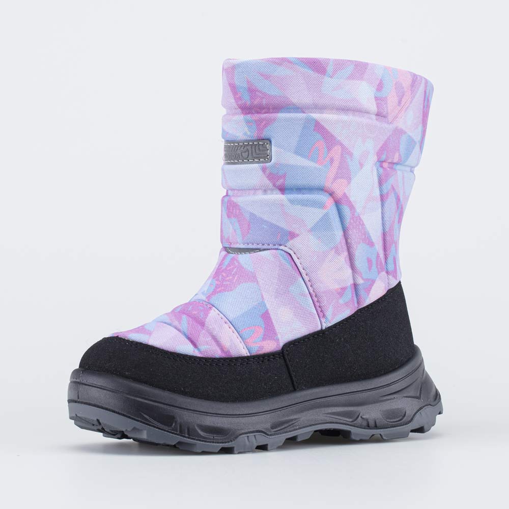 Сапожки-дутики для детей выполнены в тренде Фентези-сообщество (теплые оттенки сиреневого и голубого, объемные футуристические формы).