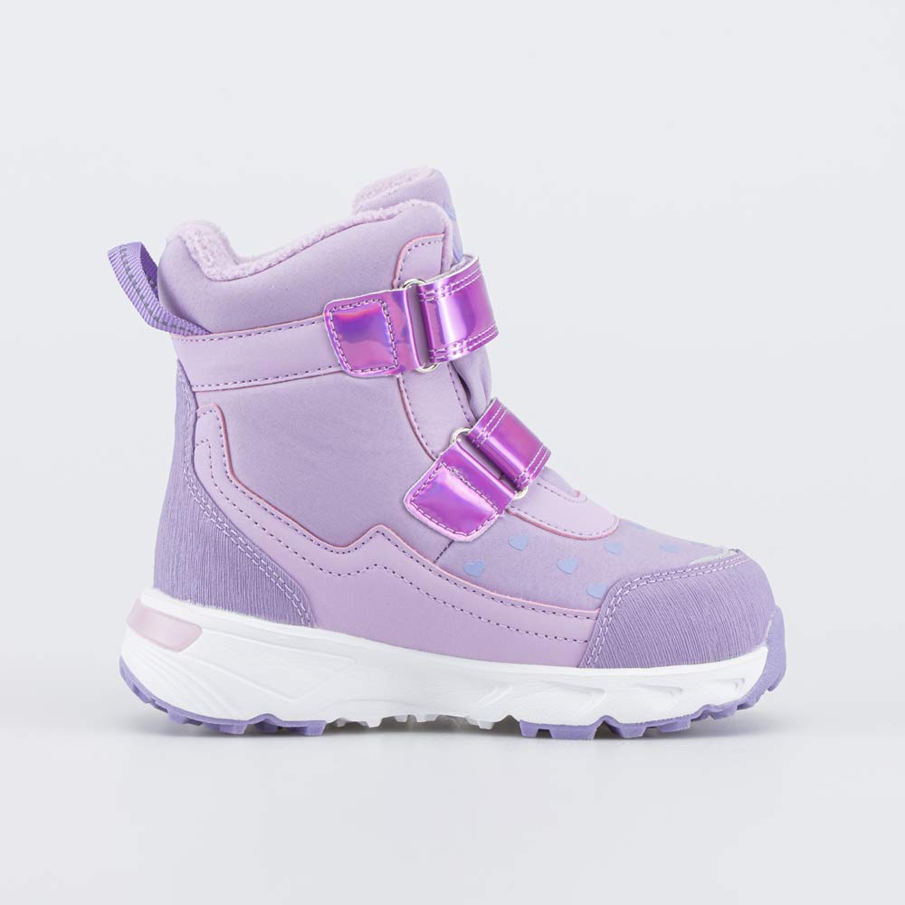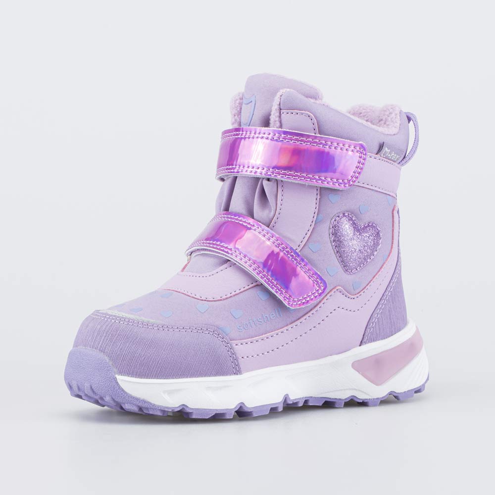 Светящиеся мембранные ботинки для девочки, украшенные сердечками и перламутровыми вставками, выполнены с применением технологии софтшелл.