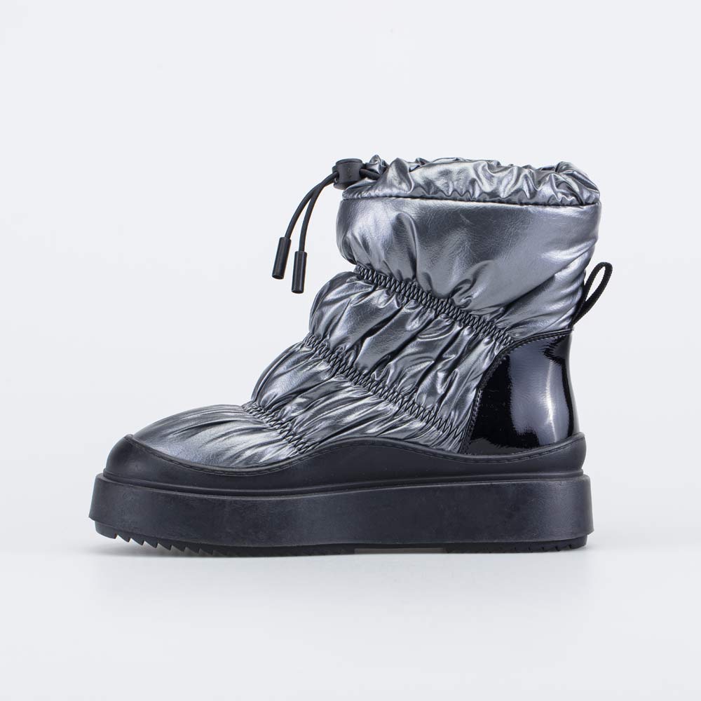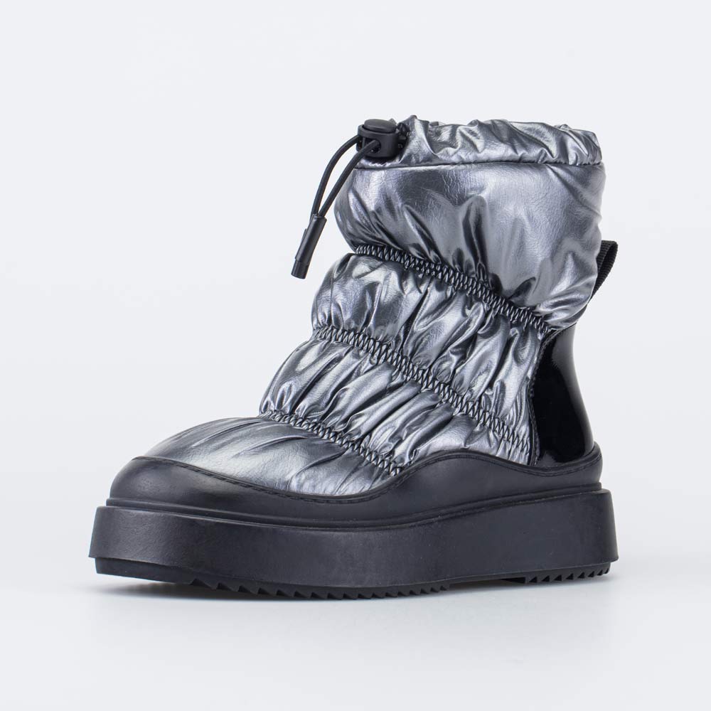 Зимние сапожки-дутики для девочки-подростка выполнены в цвете темного серебра.
