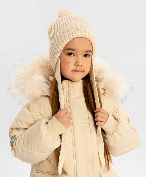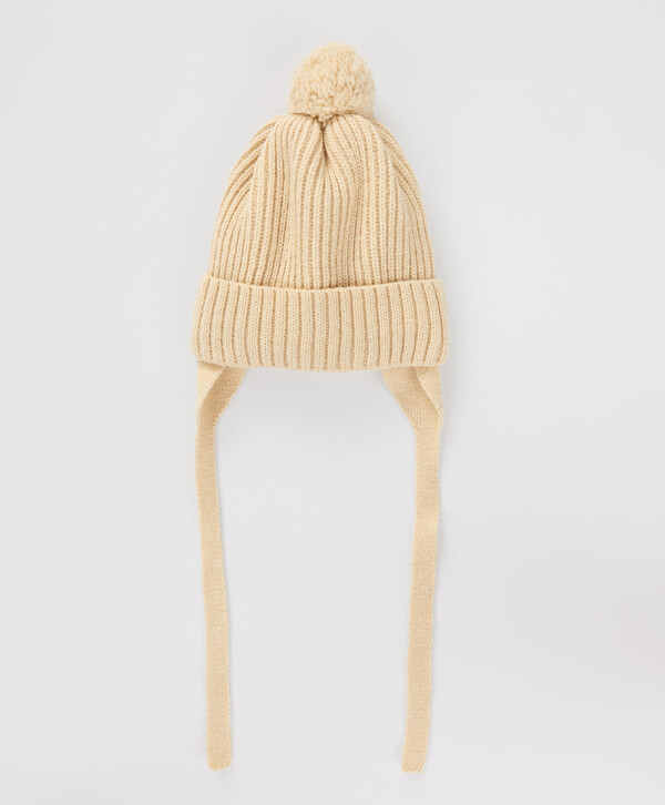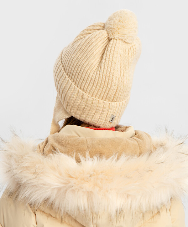 цветБежевыйверх:70% акрил/30% шерсть; подкладка:100% полиэстер Акрил Шапка бини с ушками на завязках и с помпоном бежевая детская Button Blueподкладка - флис