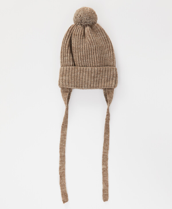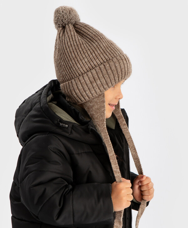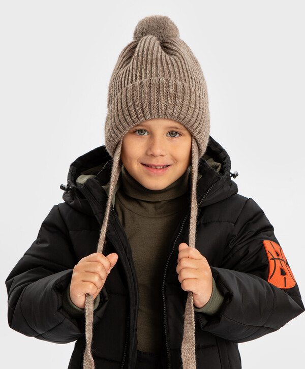 цветХакиверх:70% акрил/30% шерсть; подкладка:95% хлопок/5% эластан Шерсть/Акрил Шапка бини с ушками на завязках и с помпоном утепленная бежевая детская Button Blue7 гейдж; подкладка - флис