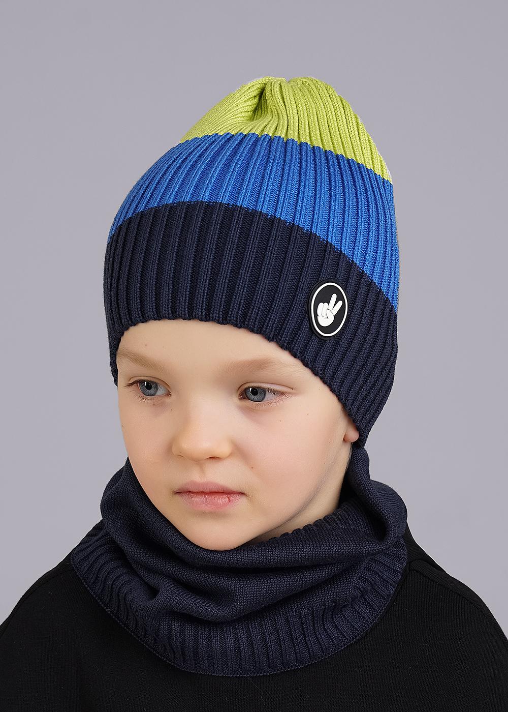 Шапка однослойная для мальчика, выполнена ластичным переплетением, декорирована силиконовой нашивкой в височной зоне. Размер 54-56