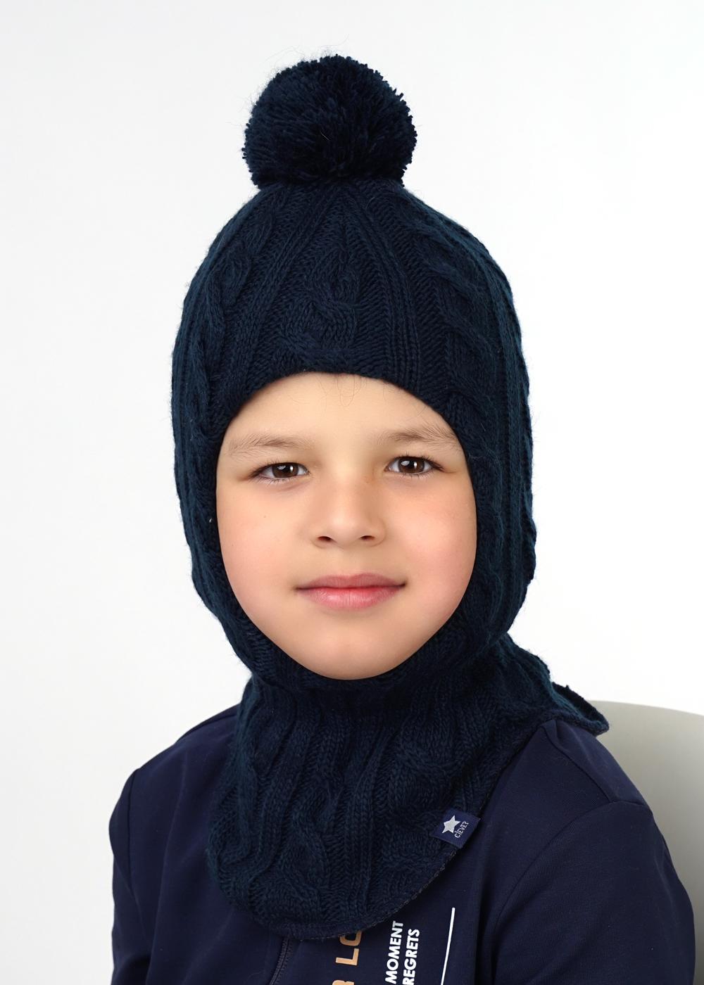 Шапка-шлем выполнен фактурным переплетением "косы" в области шеи - ластичная ножка для более плотного прилегания. Модель на синтепоне с хлопковым подкладом и помпоном из пряжи.
