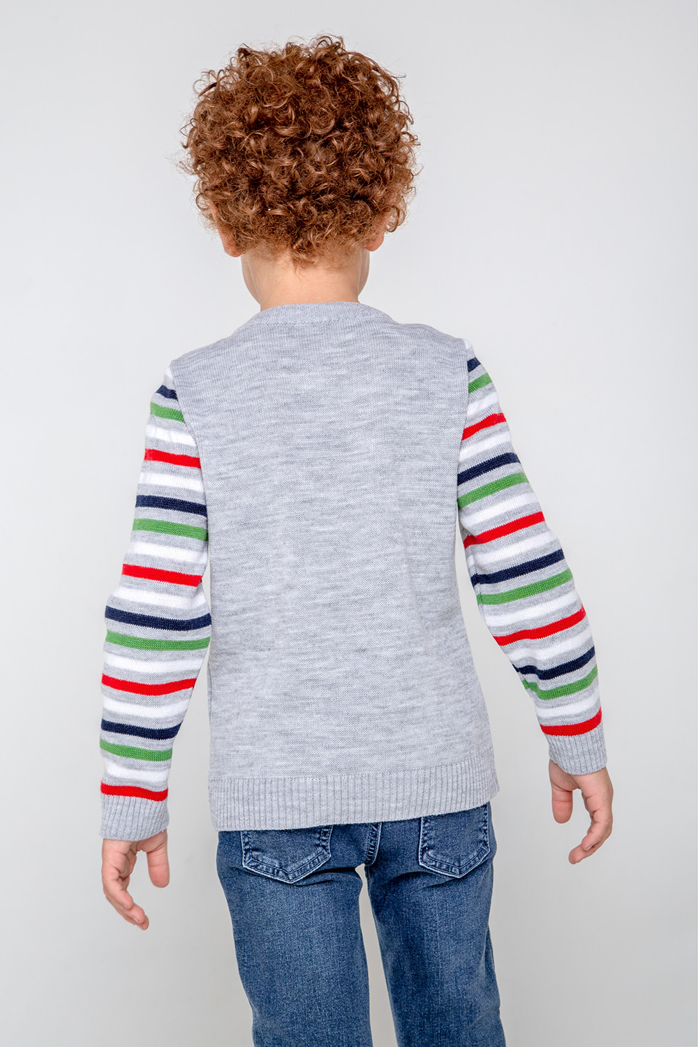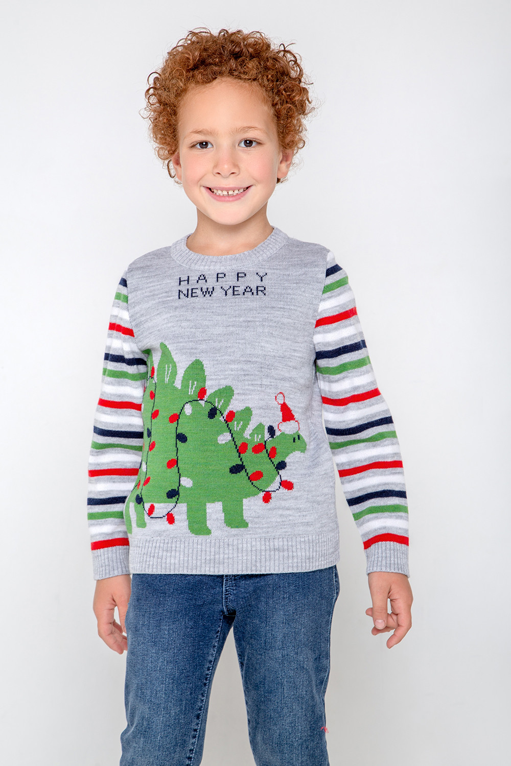 Серый джемпер с круглой горловиной. На груди - вывязанный рисунок с изображением новогоднего динозаврика. На рукавах - полосы. Горловина, манжеты и пояс связаны ластиком.