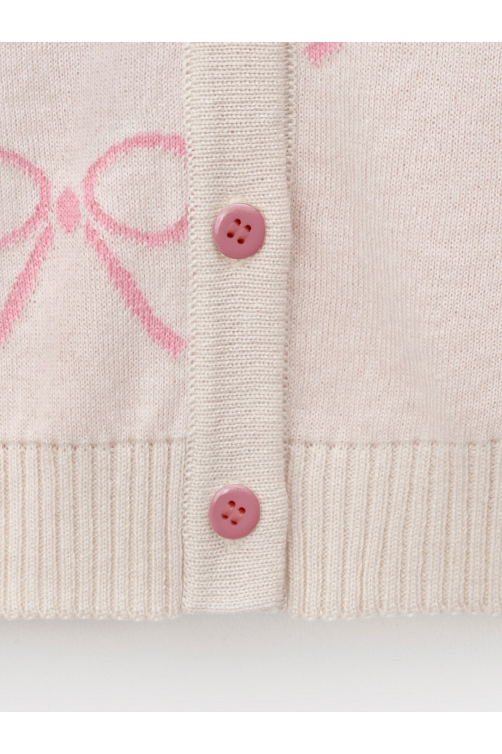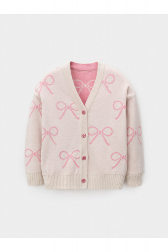 Вязаный кардиган с бантиками для девочки. Изготовлен из мягкой хлопковой пряжи с добавлением акрила. Застёгивается на планку с пуговицами. Длинные рукава с манжетами. Внизу эластичный пояс. Изделие сохраняет форму и стойкий цвет после многочисленных стирок.