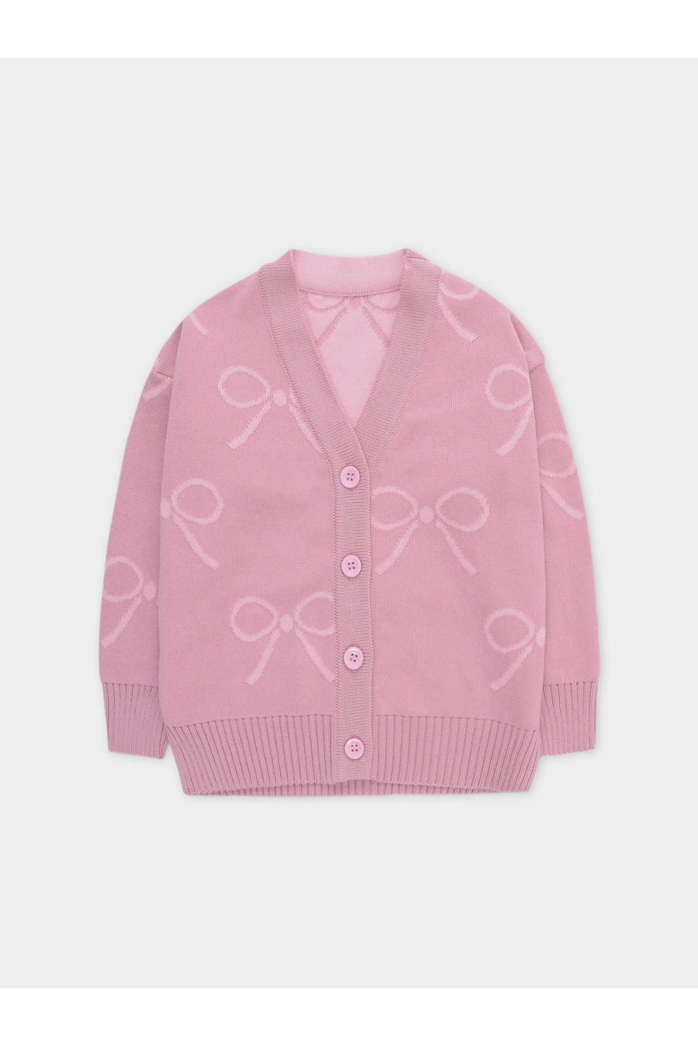 Вязаный кардиган с бантиками для девочки. Изготовлен из мягкой хлопковой пряжи с добавлением акрила. Застёгивается на планку с пуговицами. Длинные рукава с манжетами. Внизу эластичный пояс. Изделие сохраняет форму и стойкий цвет после многочисленных стирок.