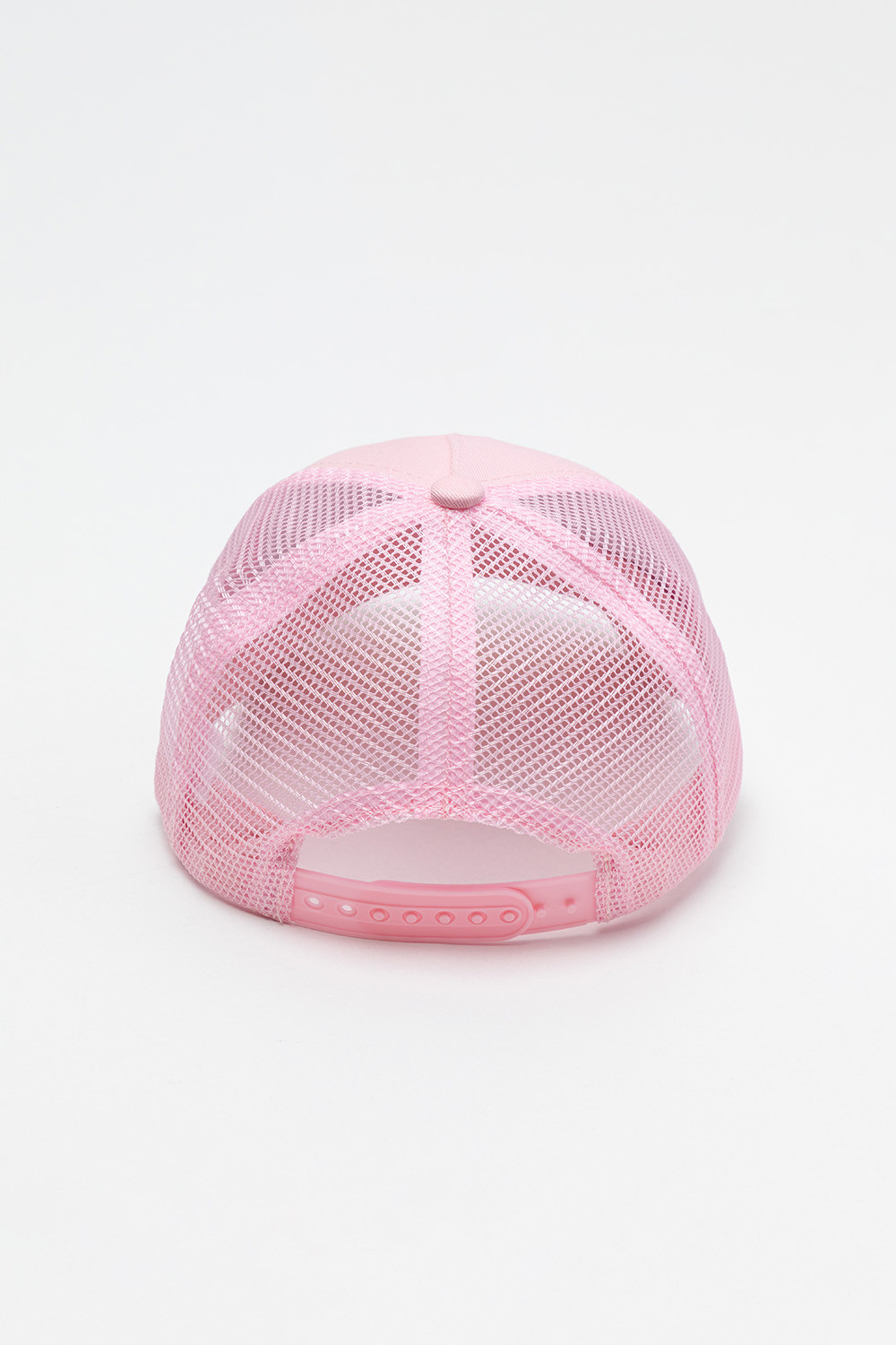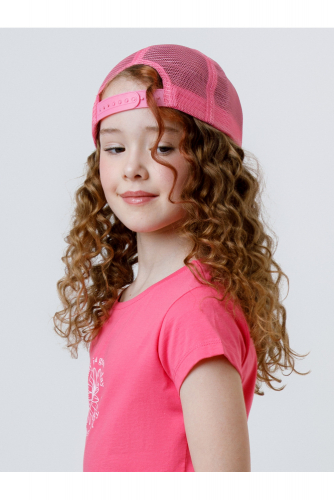 Кепка для девочки из текстиля и сетки. Спереди оригинальный принт. Регулируется по ширине и фиксируется на затылке с помощью пластиковой застежки.