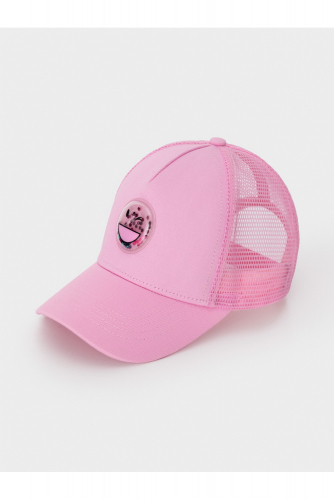 Кепка для девочки из текстиля и сетки. Спереди украшена оригинальной нашивкой. Регулируется по ширине головы и фиксируется на затылке с помощью пластиковой застёжки.