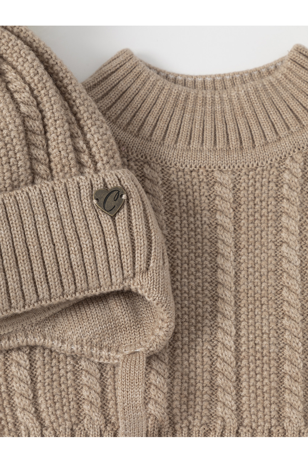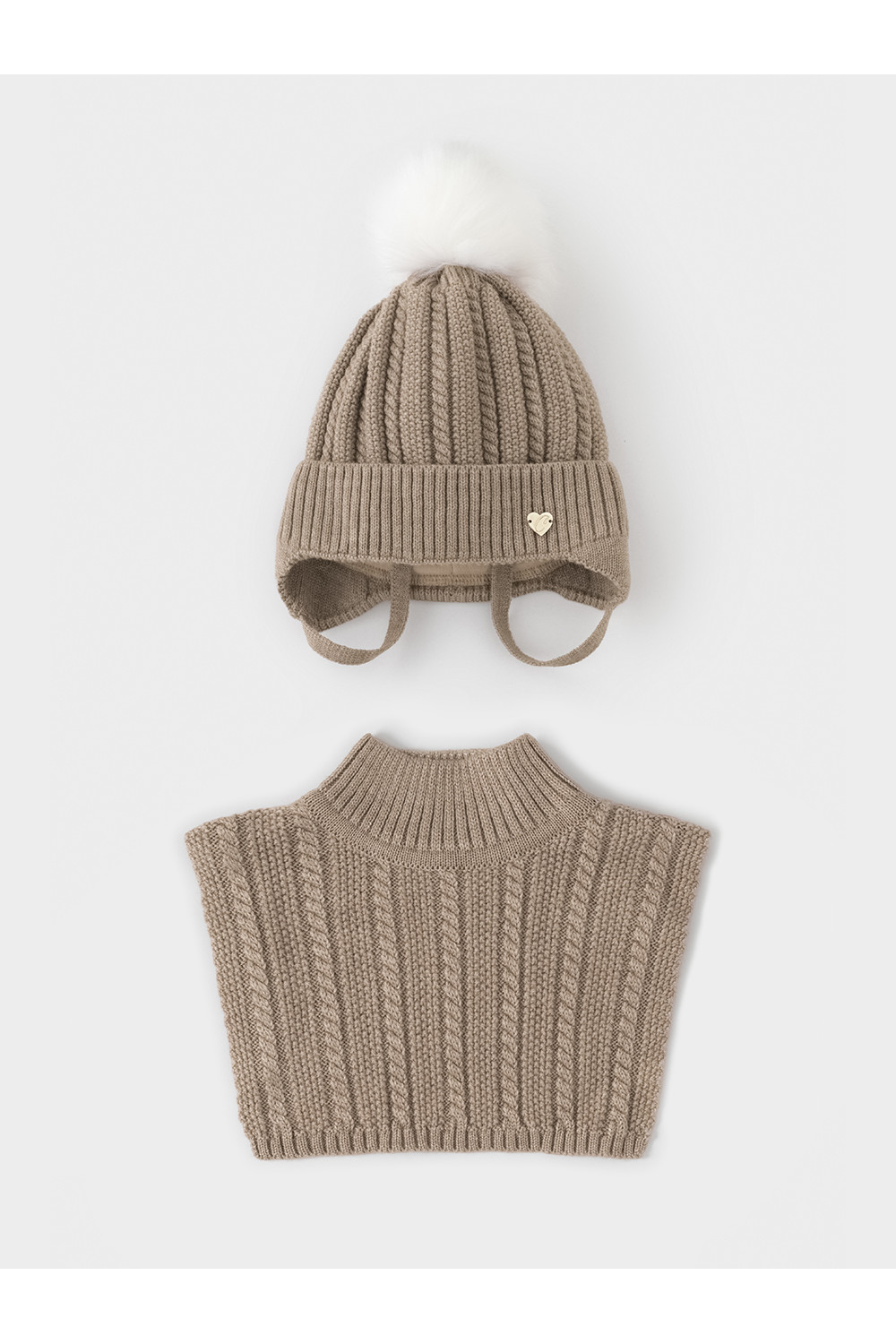 Комплект для девочки: шапка и манишка из полушерстяной пряжи. Шапка на завязках с синтепоновым утеплителем. Подклад из натурального хлопка. Полностью закрывает голову, уши и шею, защищая ребёнка от холодного воздуха и ветра. На макушке помпон. Манишка с высоким воротником с эластичным отворотом.