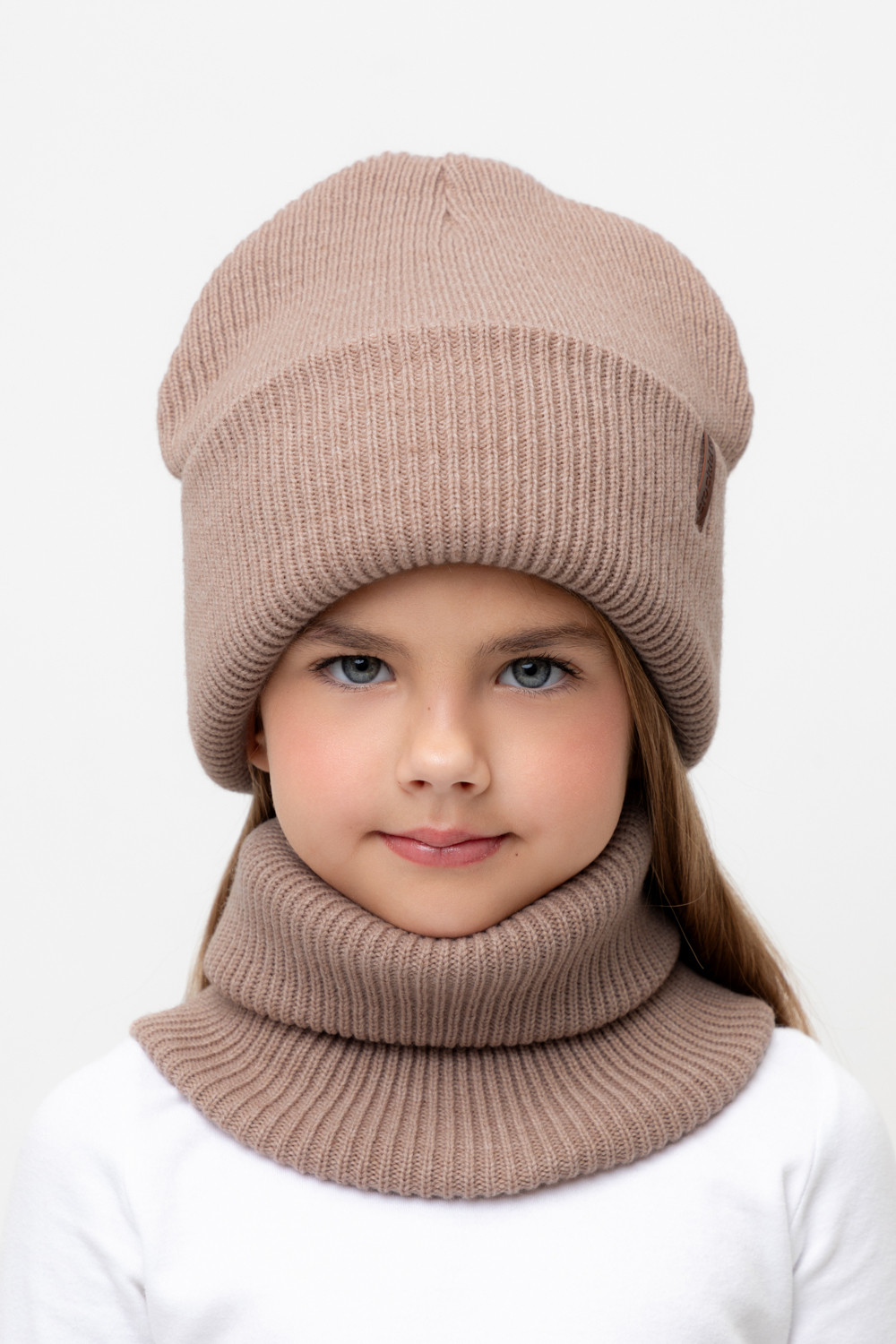 Комплект детский: шапка и снуд из полушерсти. Тёплая шапка с отворотом, украшена нашивкой из искусственной кожи. Снуд без оборотов вокруг шеи. Изделие сохраняет форму и стойкий цвет после многочисленных стирок.