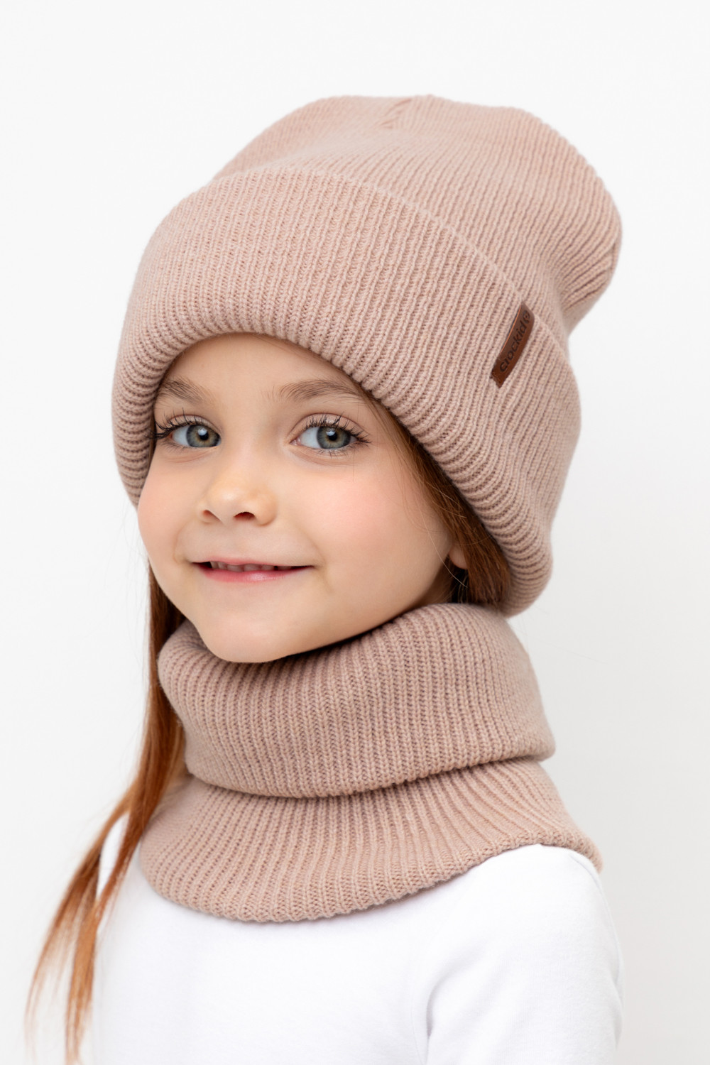 Комплект детский: шапка и снуд из полушерсти. Тёплая шапка с отворотом, украшена нашивкой из искусственной кожи. Снуд без оборотов вокруг шеи. Изделие сохраняет форму и стойкий цвет после многочисленных стирок.