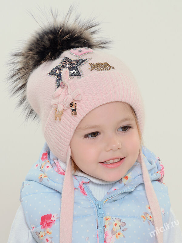 Шапочка с завязками и отворотом в резинку. Комфортна в холодную погоду благодаря утеплителю и хлопковой подкладке. Декорирована: аппликациями из пайеток, страз, стразовой композицией, бантиком с камнем в оправе и подвесками. Помпон из натурального меха енота крепится кнопкой.