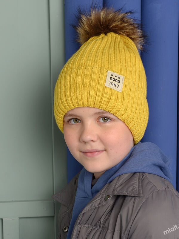 Дополнение: Удлиненная форма, отворот, подкладка с утеплителем. Помпон на кнопке - натуральный енот. Декор- шеврон.