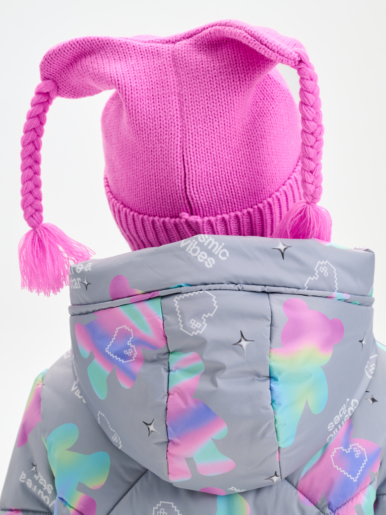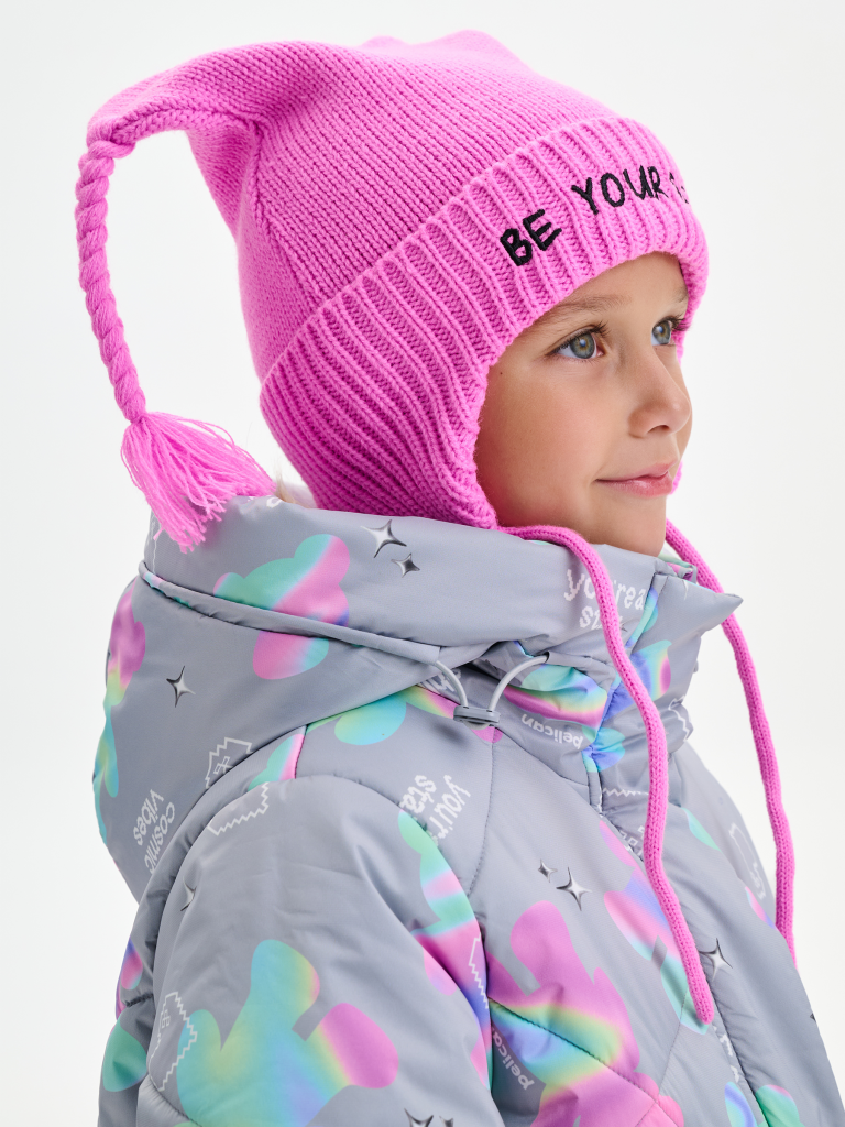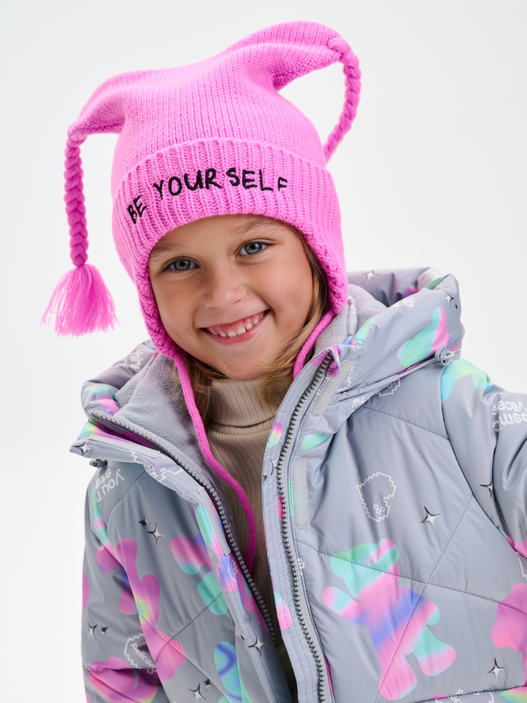 Тёплая и мягкая шапка с завязками на уютном флисовом подкладе — отличный выбор для прохладной погоды. Верхняя часть украшена забавными свисающими ушками с милыми косичками, которые придают модели игривый и неповторимый стиль. Шапка связана плотной, эластичной вязкой с аккуратным отворотом и цельновязанными ушками по низу. Модель отлично закрывает уши и шею, надёжно защищая от ветра и холода. Мягкие завязки обеспечивают комфортную и надежную фиксацию на голове. Особенный акцент — вышивка на отвороте с вдохновляющей надписью «Будь самим собой», которая придаёт образу индивидуальность и настроение.Состав: 100%акрил, подклад: 100%полиэстерВозрастная группа: Kids-JuniorСезон: ОсеньГод: 2025Пол: ДетиГодСезон: 2025 ОсеньСтратегия: Товарная категория: Дети головные уборы