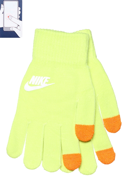 Перчатки спортивного стиля одинарные с небольшим начесом внутри. Сенсорные, пряжа на кончиках указательного и большого пальца заканчивается нитями другого цвета, что позволяет пользоваться сенсорным экраном, не снимая перчаток.