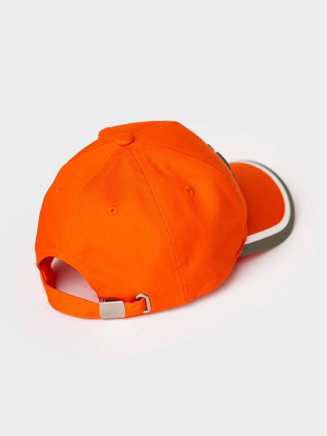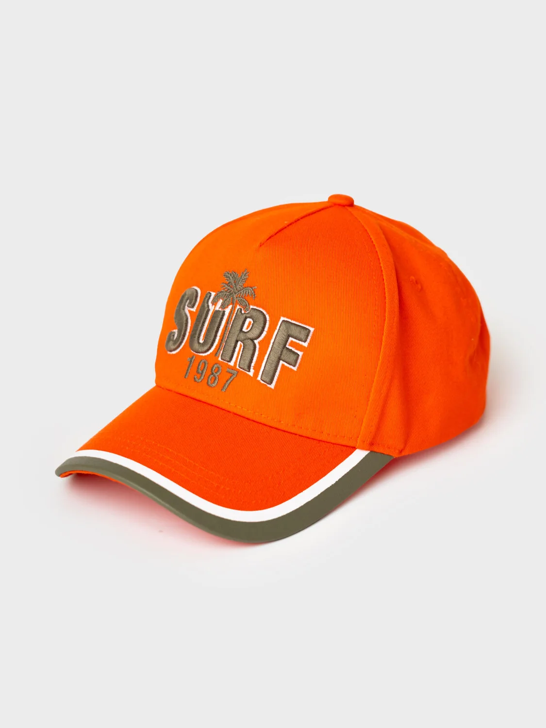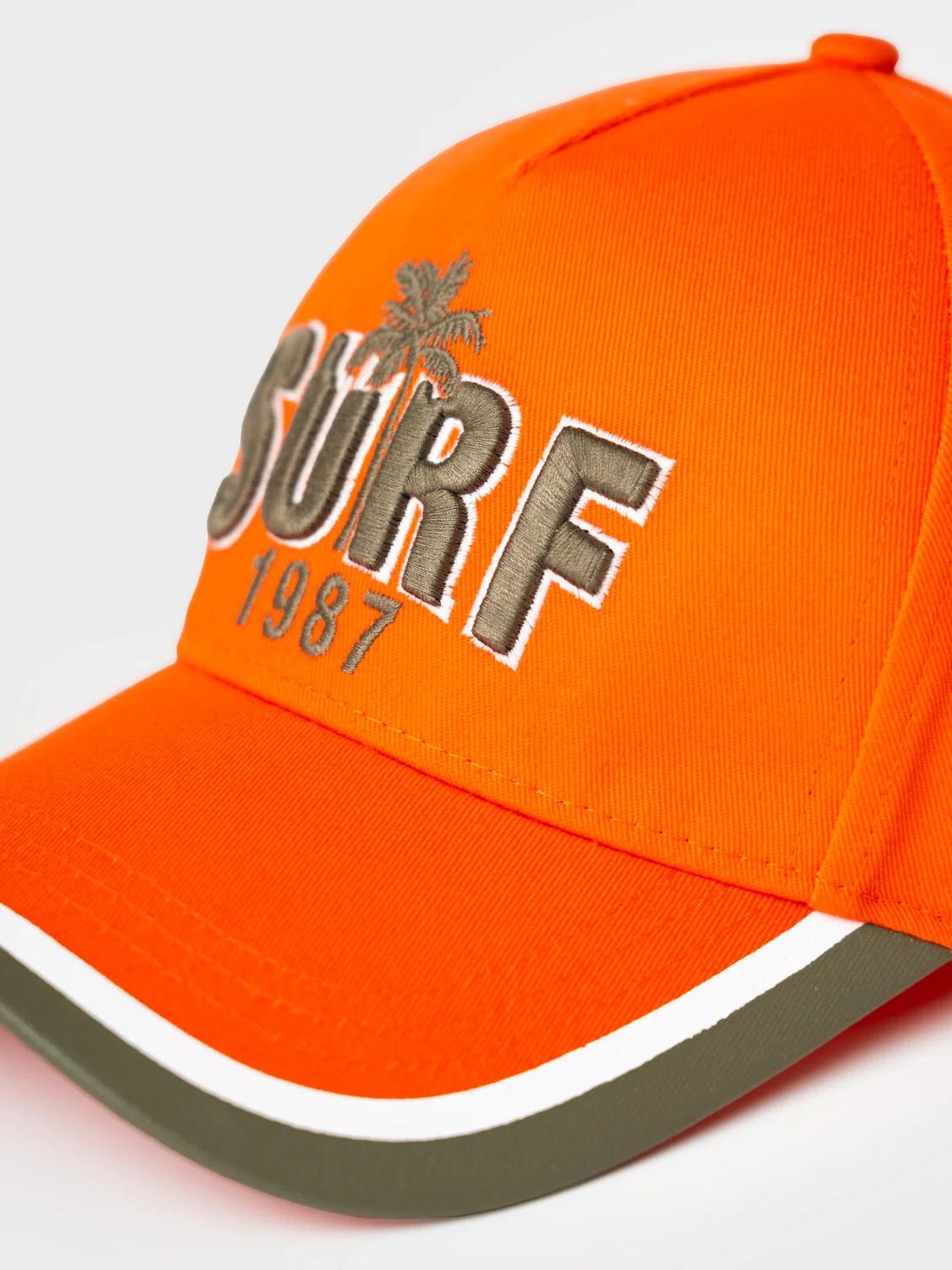 Бейсболка для мальчика подростка. Выполнена в ярком оранжевом цвете с жёстким изогнутым козырьком и контрастной отделкой по краю. Спереди — крупная вышивка, изображением пальмы. Сзади есть регулируемая застежка с металлической пряжкой. Вентиляционные отверстия.