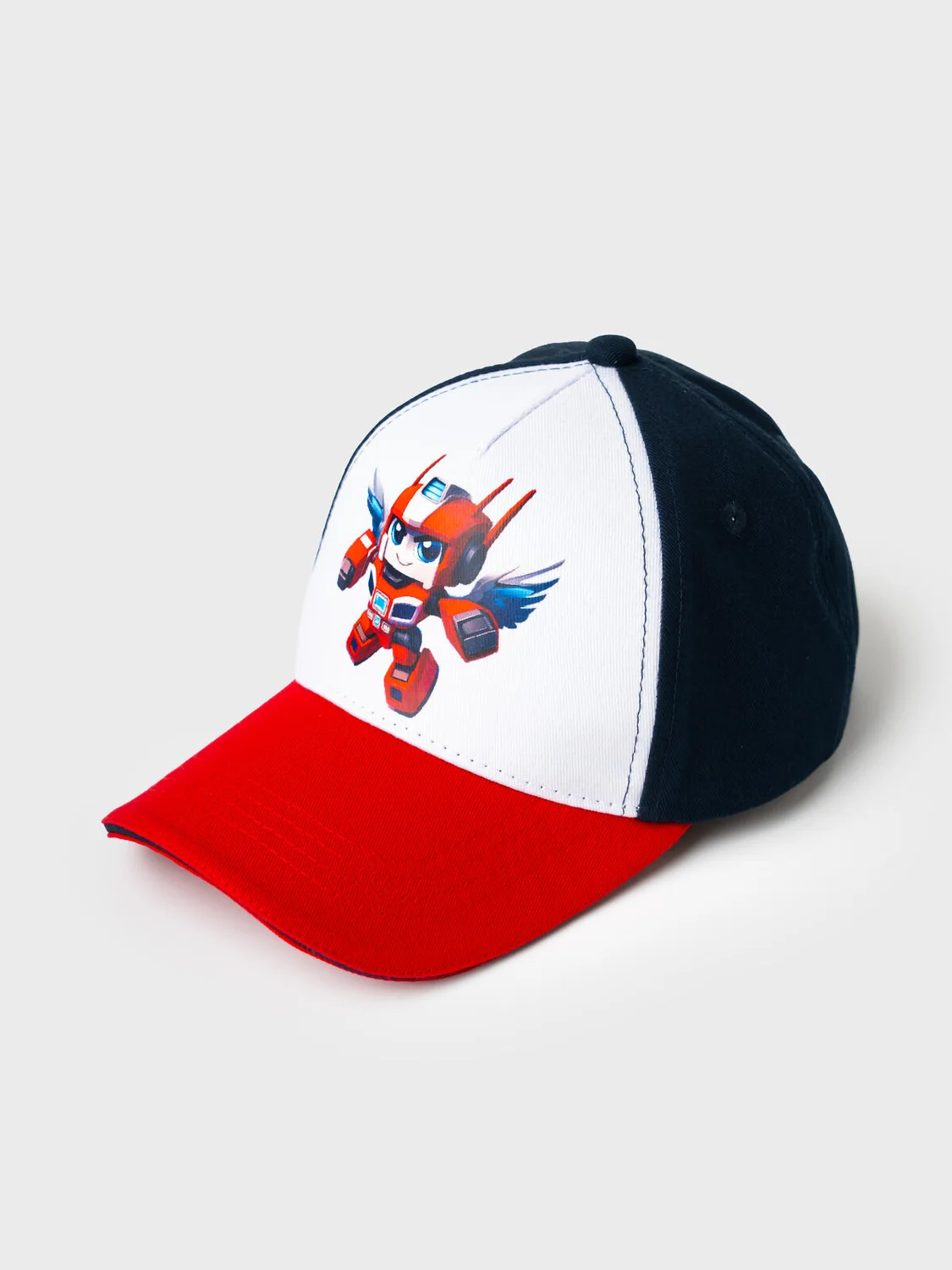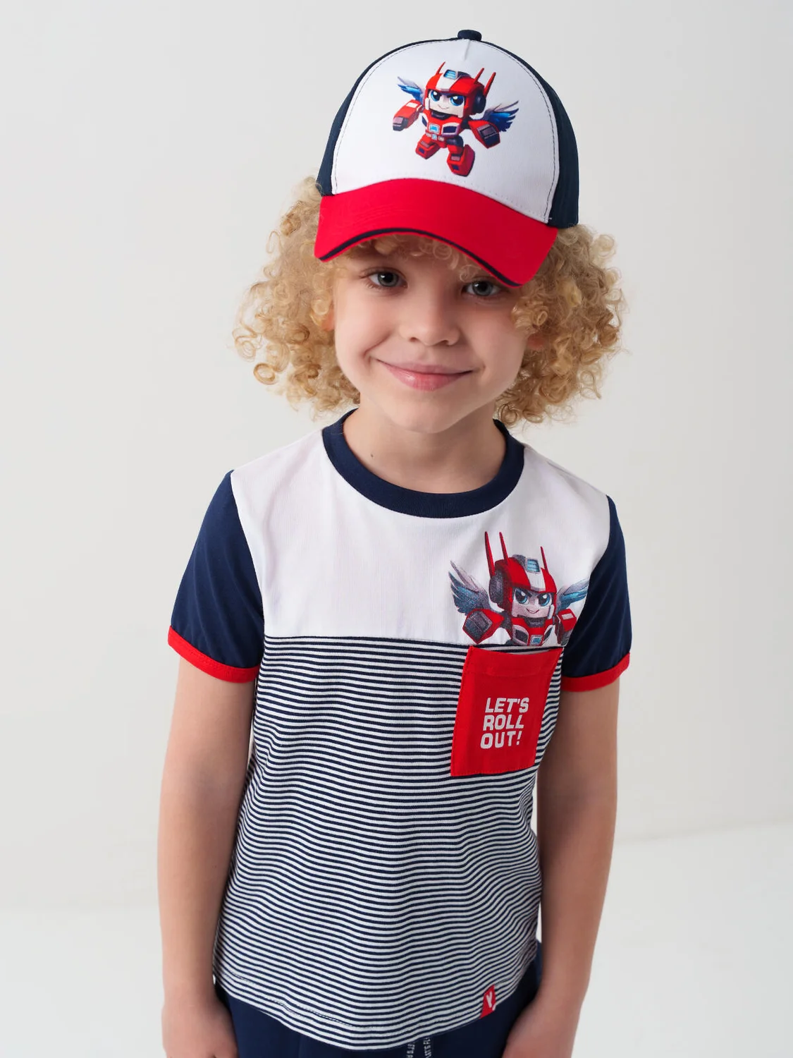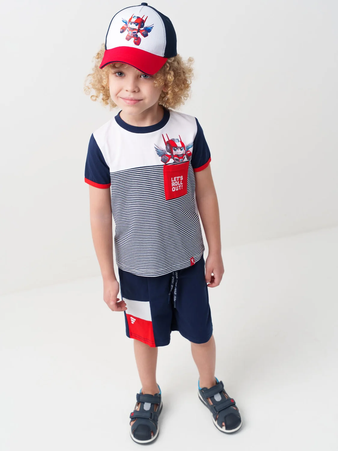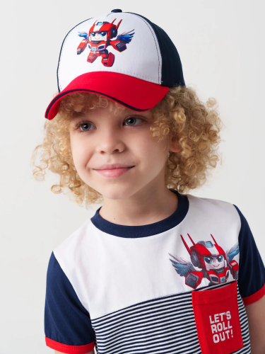 Бейсболка детская для мальчика. На изогнутом козырьке контрастная декоративная строчка. Спереди размещён крупный рисунок, а сзади — логотип. Размер можно отрегулировать с помощью застежки на липучке. Есть вентиляционные отверстия и верхняя декоративная кнопка.