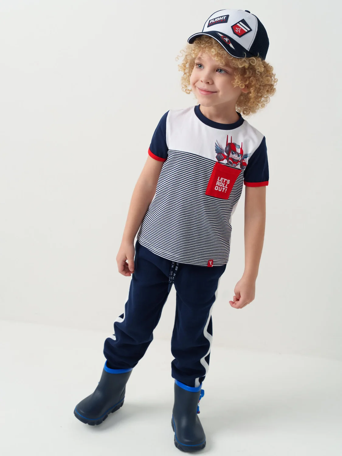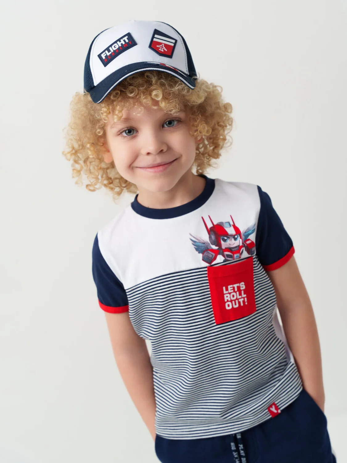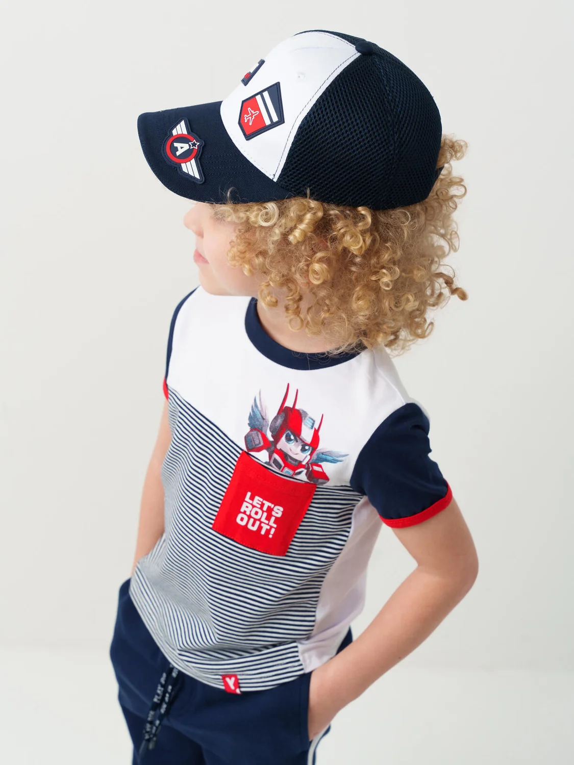 Детская бейсболка для мальчика. Передняя часть выполнена из плотной хлопковой ткани, боковые и задние части — из дышащей сетки. Козырёк изогнутый. Слева спереди — нашивка, рядом — декоративный элемент с самолётом. На козырьке размещён шеврон. Сзади — регулировка на липучке.