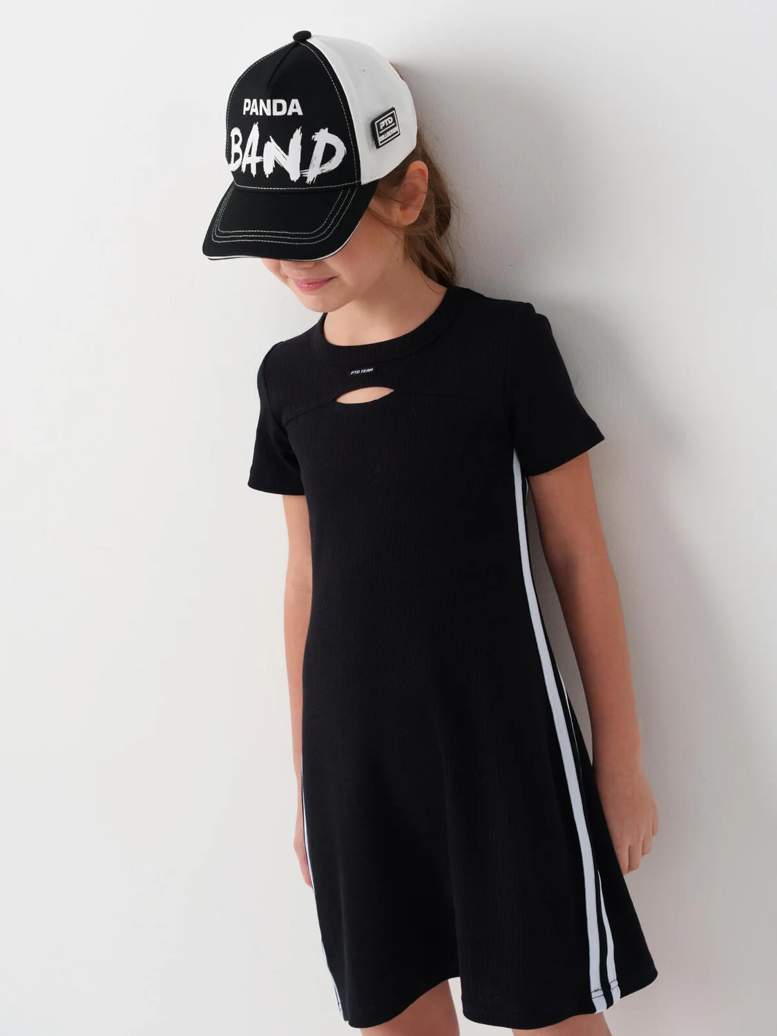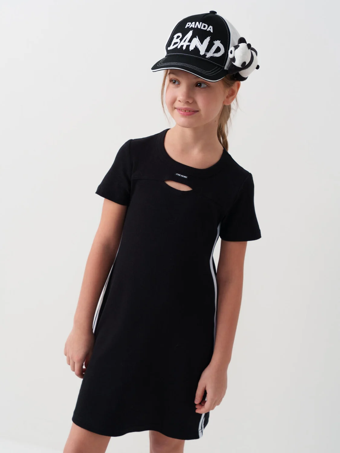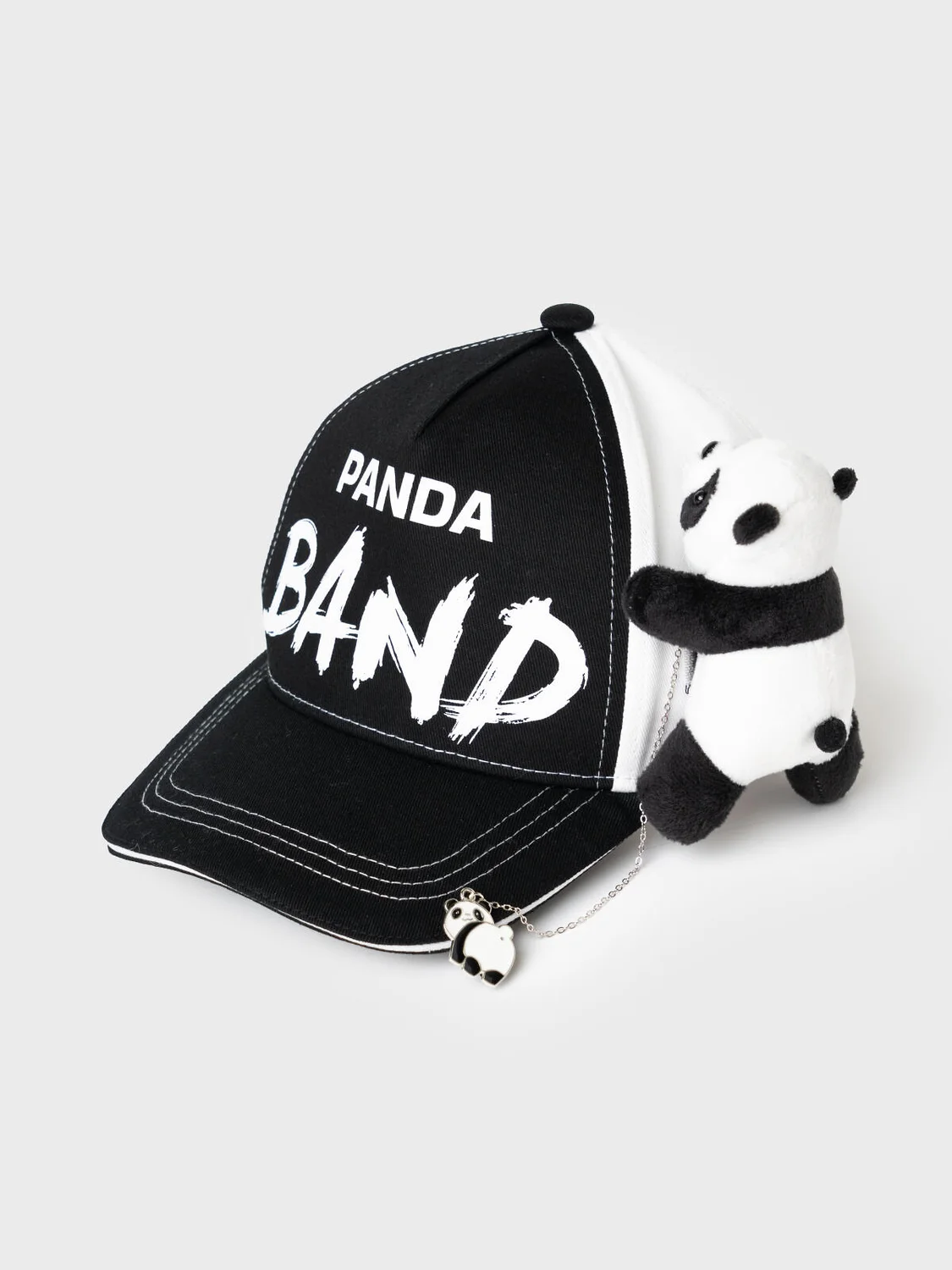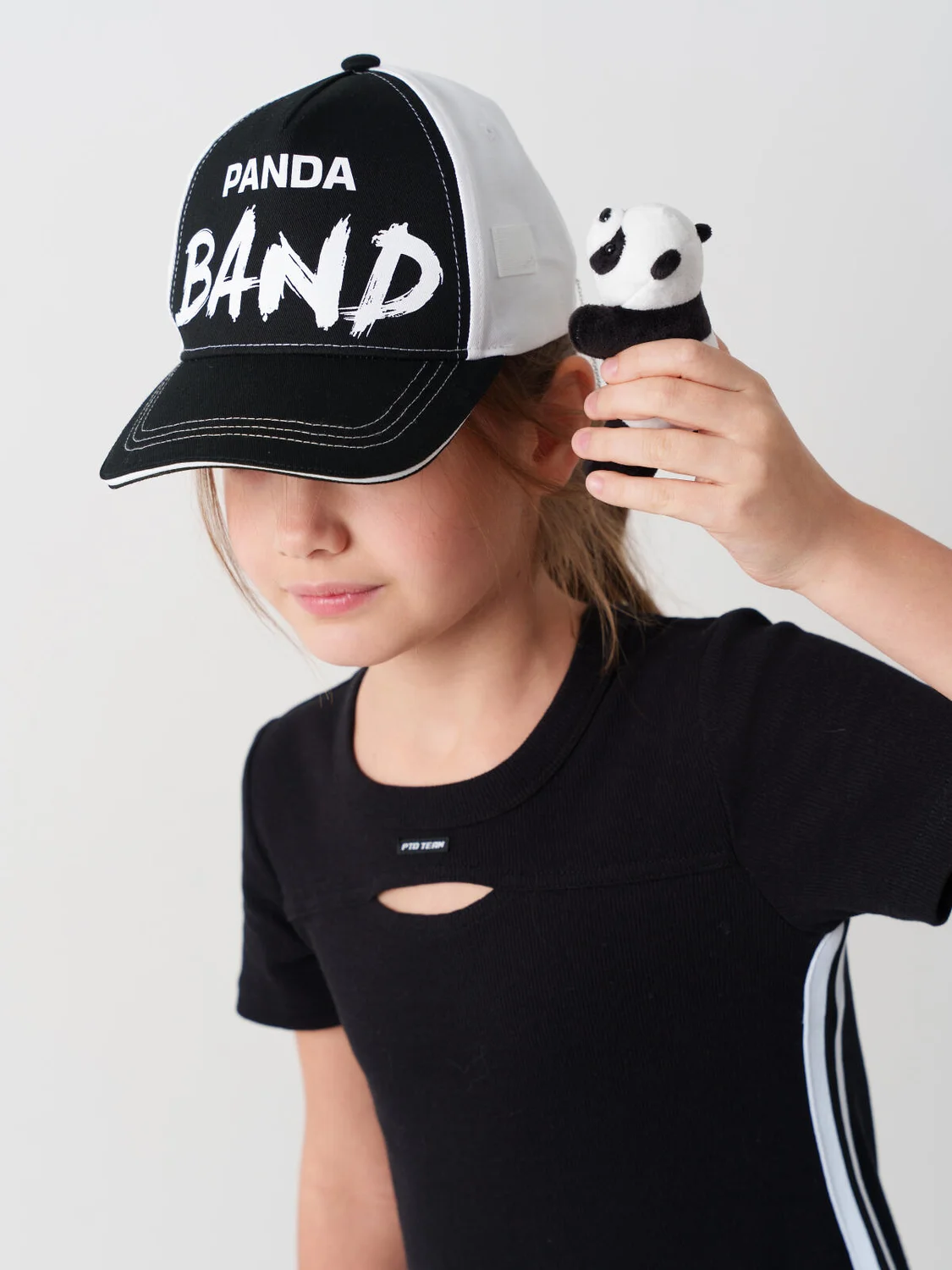 Бейсболка для девочки подростка. На передней части — крупная надпись, сбоку — мягкая игрушка-панда, которая крепится на цепочке и легко снимается. Задняя часть регулируется пластиковой застежкой на кнопки, что удобно для подгонки по размеру. Козырёк изогнутый. Вентиляционные отверстия.