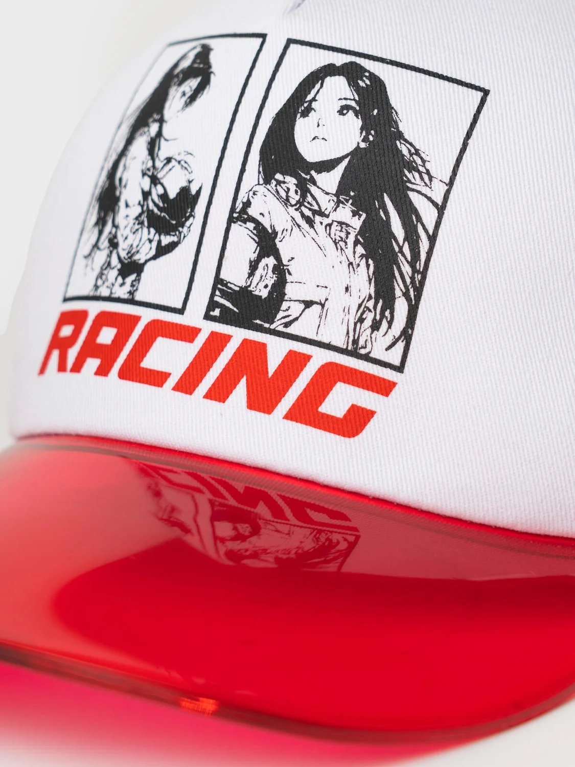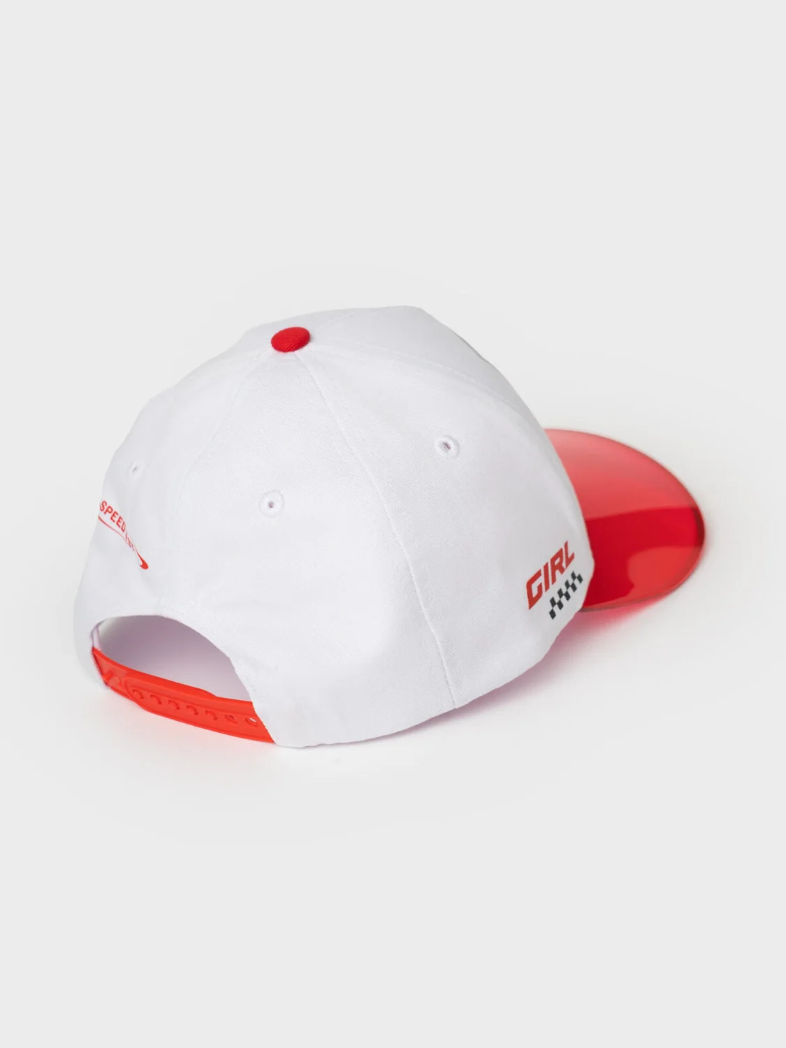 Бейсболка для девочки подростка. Козырек изогнутый прозрачный. Спереди — стильный принт с изображениями девушек-гонщиц. Застежка сзади регулируется с помощью пластикового ремешка на кнопках. Отверстия обеспечивают вентиляцию.