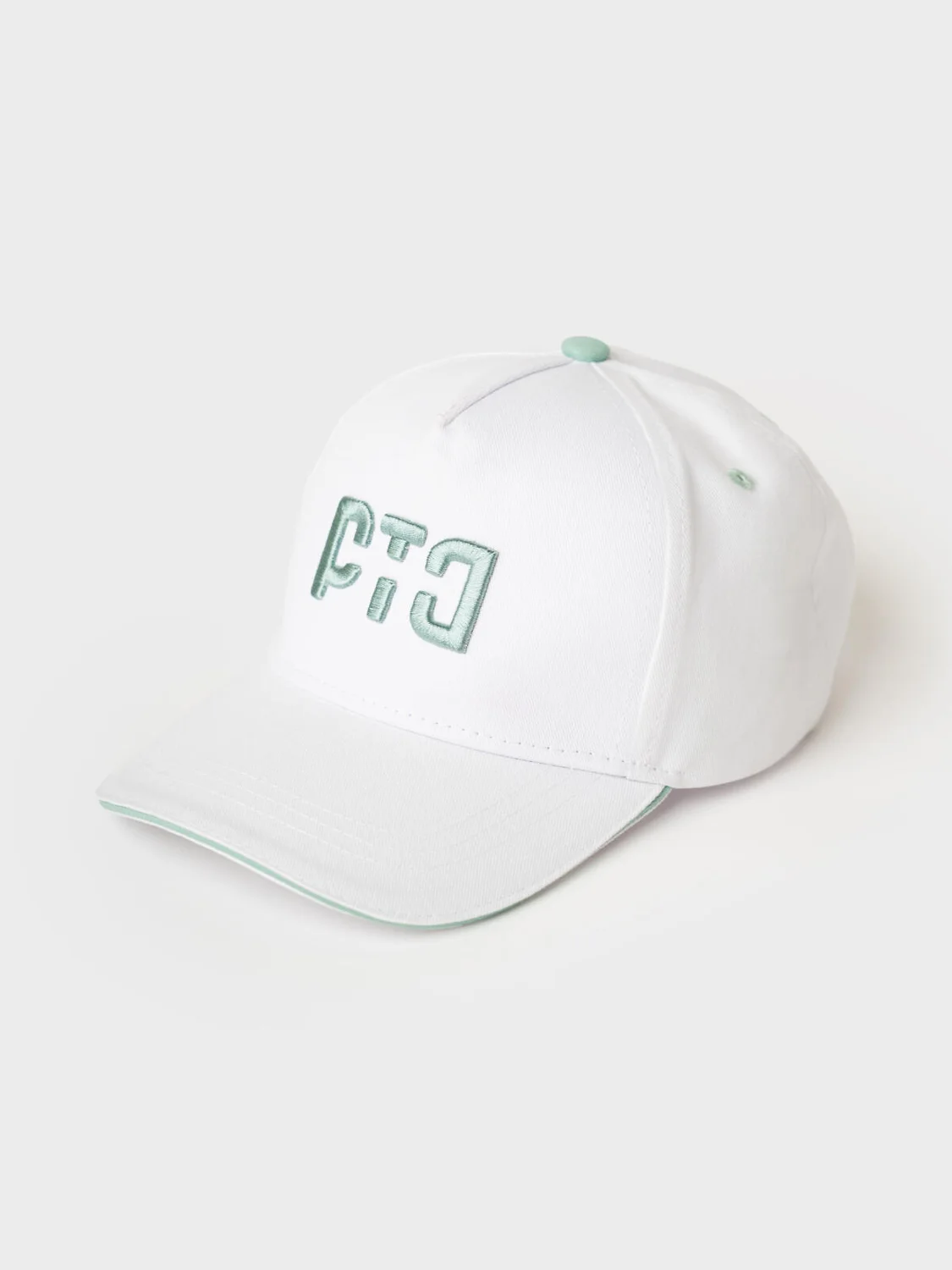 Бейсболка детская для девочки. Классическая с изогнутым козырьком. На передней панели выполнена объёмная вышивка в мятном цвете. В верхней части – маленькая декоративная кнопка, по бокам – вентиляционные отверстия. Объём можно отрегулировать с помощью металлической застежки-пряжки сзади.