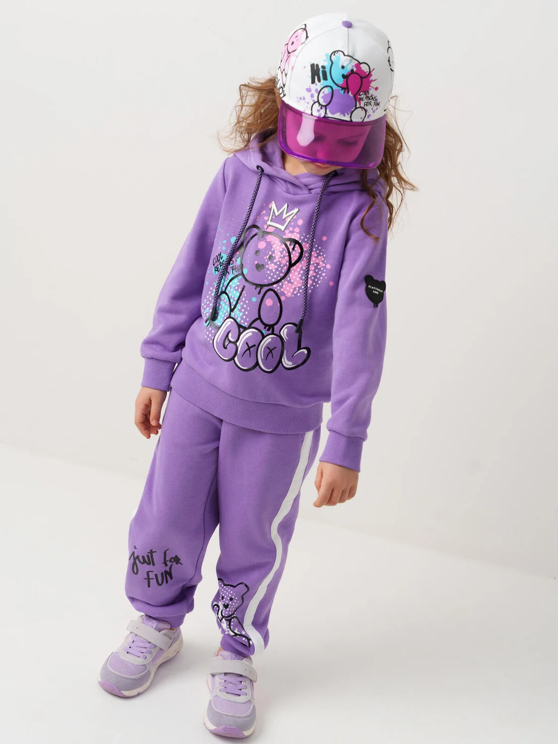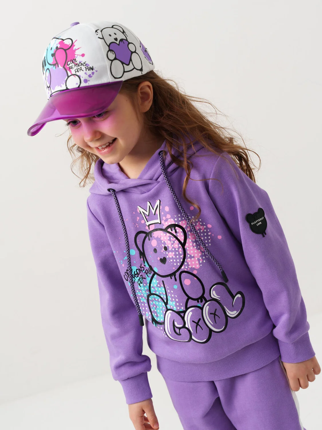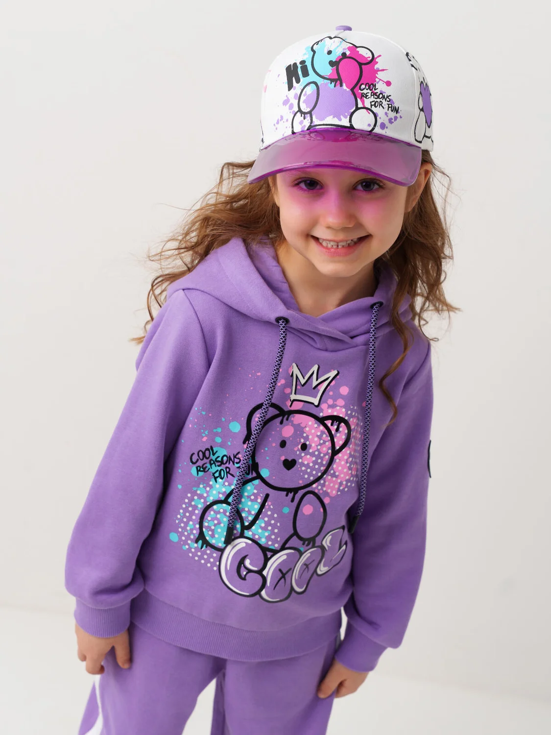 Бейсболка детская для девочки. Стильная модель выполнена из белой хлопковой ткани. Яркий принт с мишками. Изогнутый прозрачный козырек. Регулировка ширины липучкой.