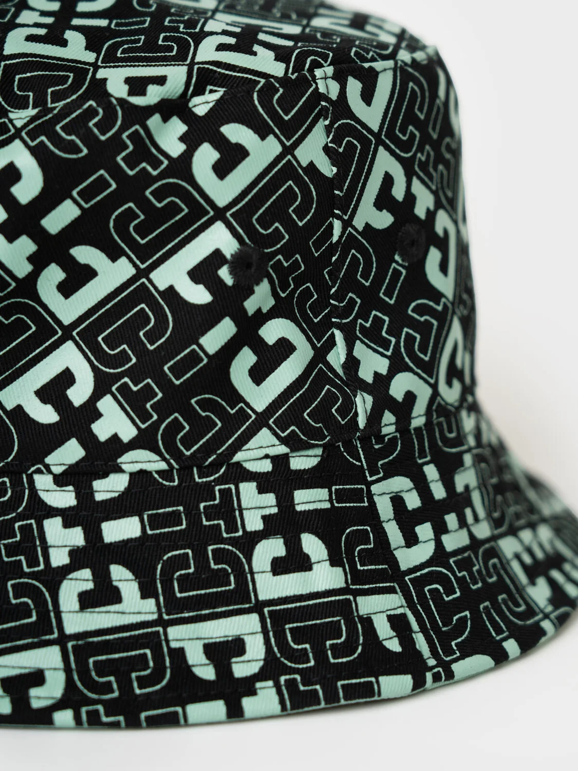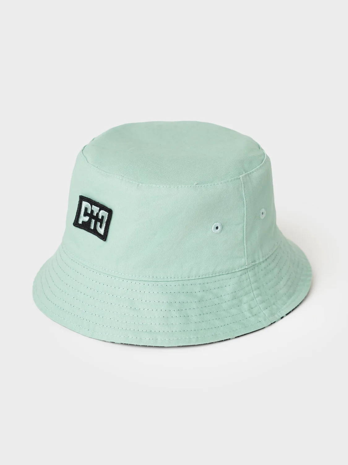 Cтильная двухсторонняя панама для мальчика подростка. Одна сторона выполнена в однотонном мятном цвете с контрастным логотипом, другая — с ярким чёрно-мятным принтом.