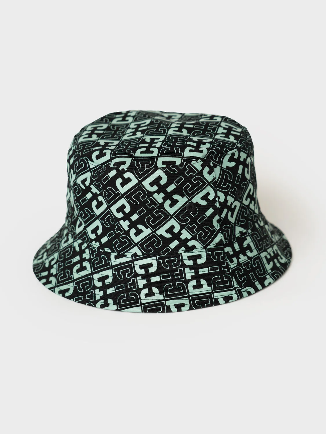 Cтильная двухсторонняя детская панама для мальчика. Одна сторона выполнена в однотонном мятном цвете с контрастным логотипом, другая — с ярким чёрно-мятным принтом.