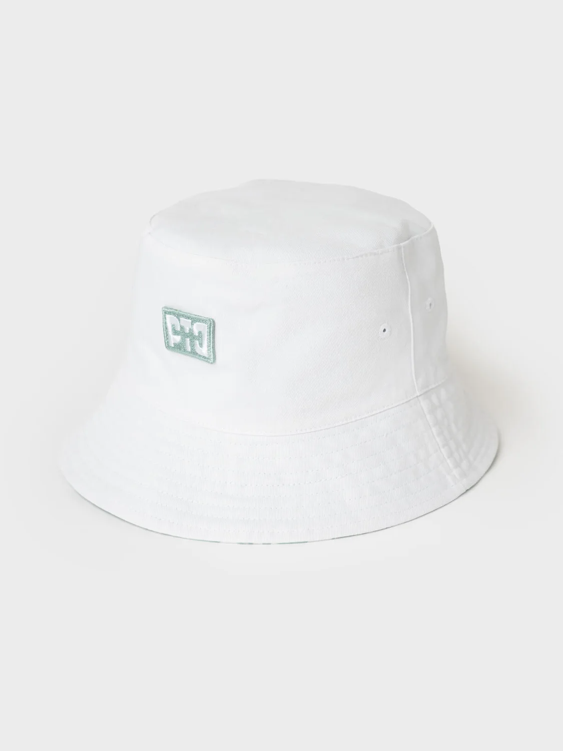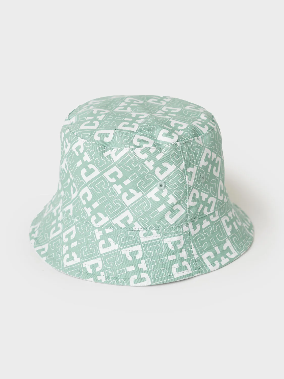 Двусторонняя детская панама для девочки. С одной стороны она полностью покрыта светло-зелёным принтом с логотипами, а с другой — однотонная белая с небольшим логотипом по центру. Панама выполнена из лёгкой хлопковой текстильной ткани, идеально подходящей для тёплой погоды. Поля средней ширины, мягко ниспадают и аккуратно отстрочены.