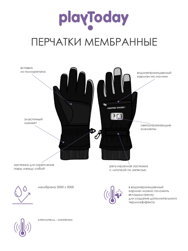 Зимние перчатки с мембраной. Утеплитель - синтепон. Мягкая ладошка из влагостойкого полиуретана. Регулируемая застёжка с липучкой по запястью. Застежка для скрепления пары между собой. Эластичный манжет. Светоотражающие элементы. Водонепроницаемый карман на молнии. Верх: 100% полиэстерПодкладка: 100% полиэстерНаполнитель: 100% полиэстер