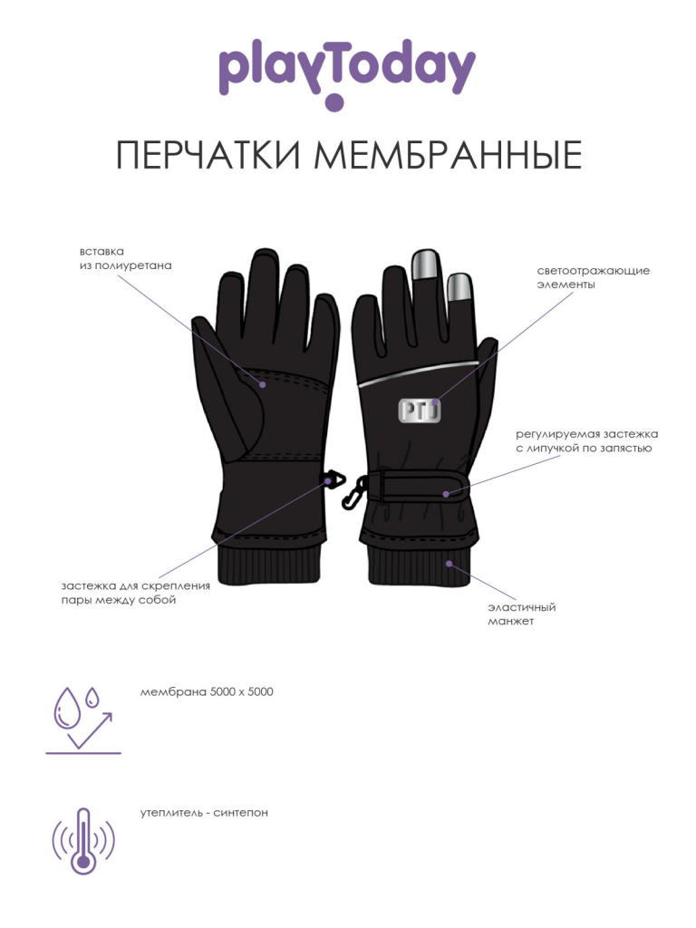 Зимние перчатки с мембраной. Утеплитель - синтепон. Мягкая ладошка из влагостойкого полиуретана. Регулируемая застёжка с липучкой по запястью. Застежка для скрепления пары между собой. Эластичный манжет. Светоотражающие элементы. Верх: 100% полиэстерПодкладка: 100% полиэстерНаполнитель: 100% полиэстер