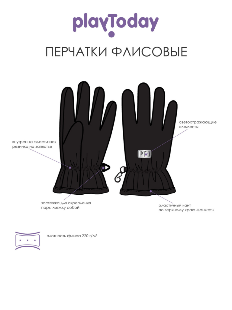 Зимние перчатки из флиса плотностью 220 г/м2. Эластичный кант по верхнему краю манжеты. Застежка для скрепления пары между собой. Внутренняя эластичная резинка на запястье. Светоотражающие элементы. 100% полиэстер