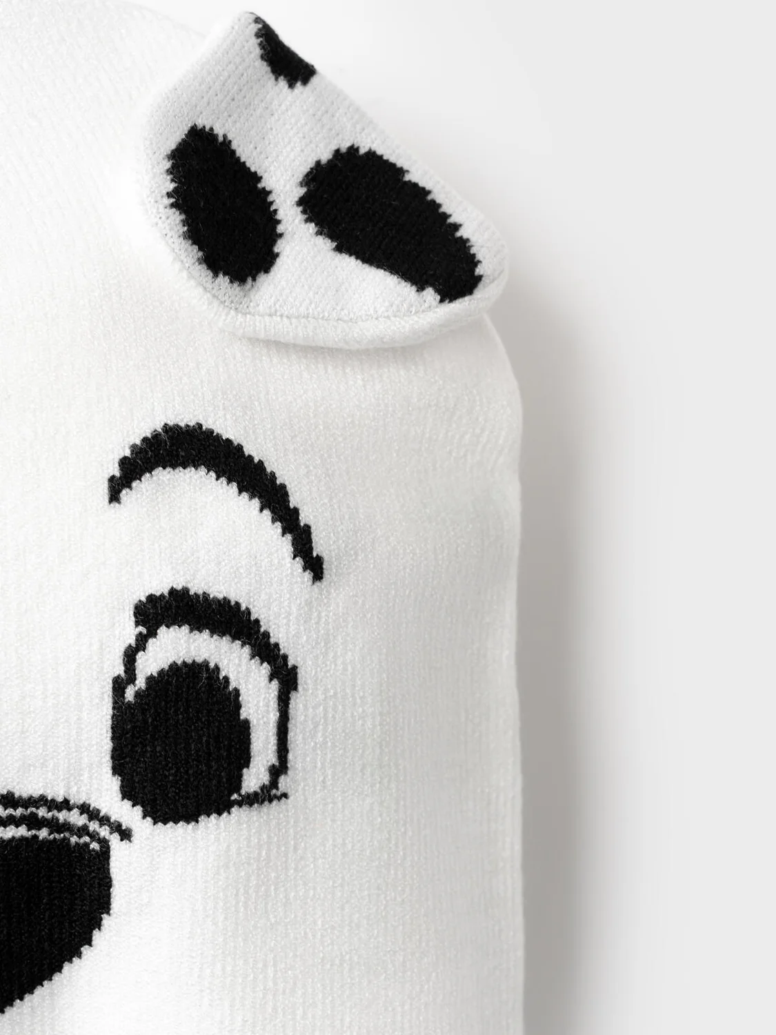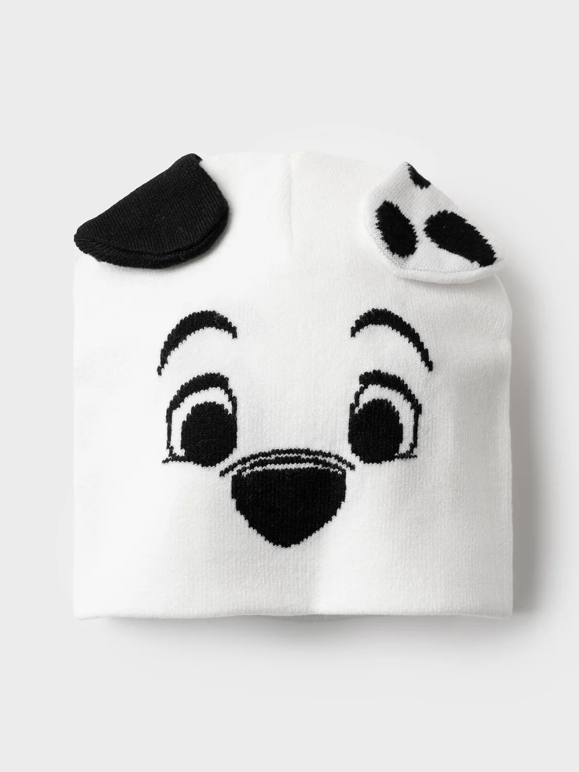 Детская трикотажная шапка для девочки. Модель из плотного вязаного трикотажа одинарной вязки с декоративным оформлением в виде мордочки щенка. На лицевой стороне шапки — выразительная аппликация: глаза, нос и ухо щенка. По бокам пришиты декоративные «ушки», имитирующие ушки животного. Низ шапки оформлен аккуратным подворотом, что улучшает посадку.