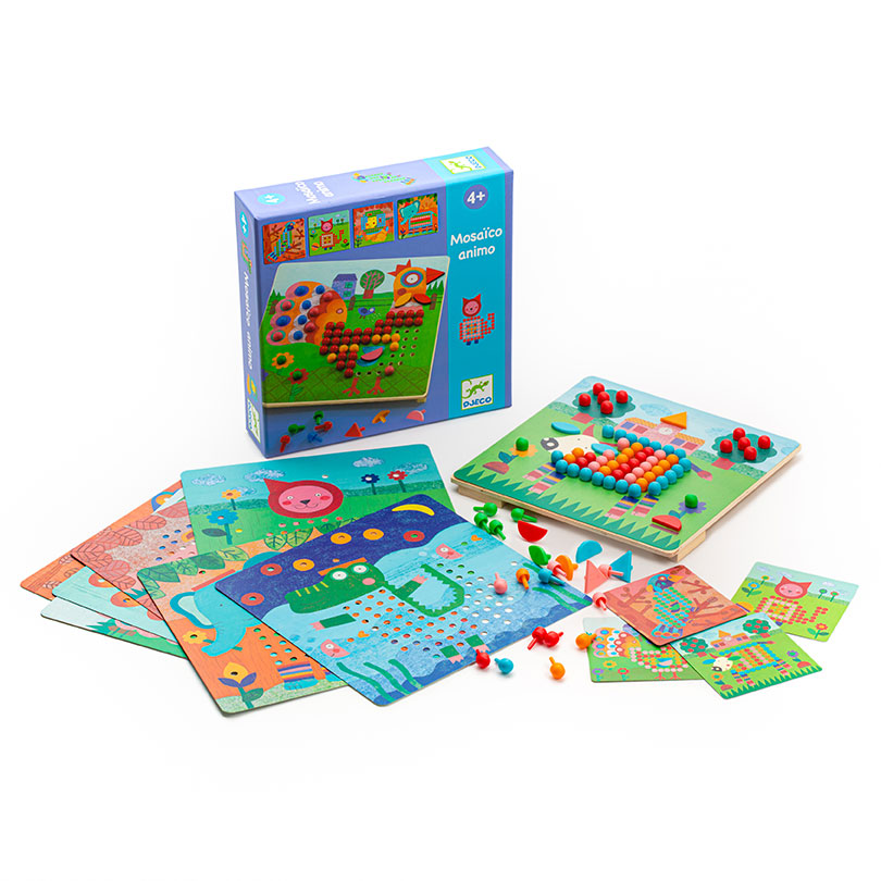 Мозаика Животные от французского производителя Djeco (Джеко) станет увлекательной развивающей игрой для каждого малыша._x000D_ _x000D_ В комплекте ребенок найдет деревянную основу, красочные карточки с заданиями, карточки-базы для создания своей картины-мозаики, а также множество пластиковых гвоздиков различных форм и цветов. Ребенок должен собрать картинку согласно инструкции, в результате чего у него получатся яркий петушок, забавный слоненок или львенок и другие животные и птицы._x000D_ _x000D_ В наборе:_x000D_ _x000D_ деревянная основа,_x000D_ 8 карточек с заданиями, 8 карточек-баз с отверстиями,_x000D_ 230 маленьких разноцветных гвоздиков разных форм._x000D_ _x000D_ Игра прекрасно развивает фантазию и воображение ребенка, детскую моторику, логическое мышление и сообразительность._x000D_ Набор изготовлен из безопасных высококачественных материалов._x000D_ _x000D_ Французская компания Джеко уже более 60 лет производит развивающие игрушки и игры для детей, наборы для творчества, а также детали интерьера детской комнаты и детские аксессуары. Все товары Джеко отличаются высочайшим качеством, необычной идеей исполнения. Дизайн и иллюстрации к игрушкам Джеко разрабатываются совместно со всемирно известными художниками.