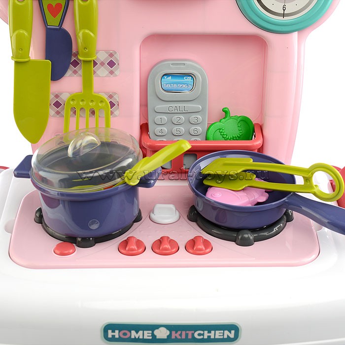 В комплекте 19 элементов для сборки кухни и 23 аксессуара для готовки (вилка, ложка, ножи, лопатки, поварешка, щипцы, кружки, тарелки, кастрюля, сковорода, продукты, телефон).