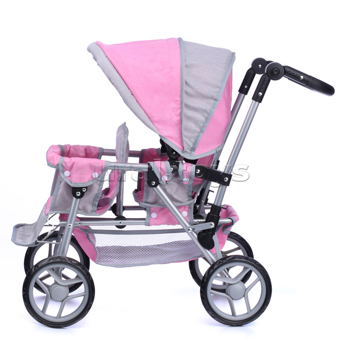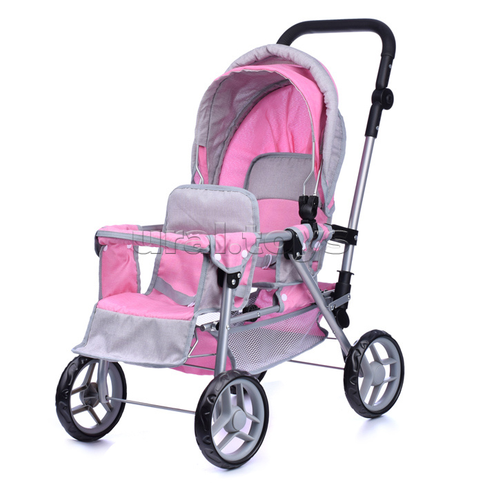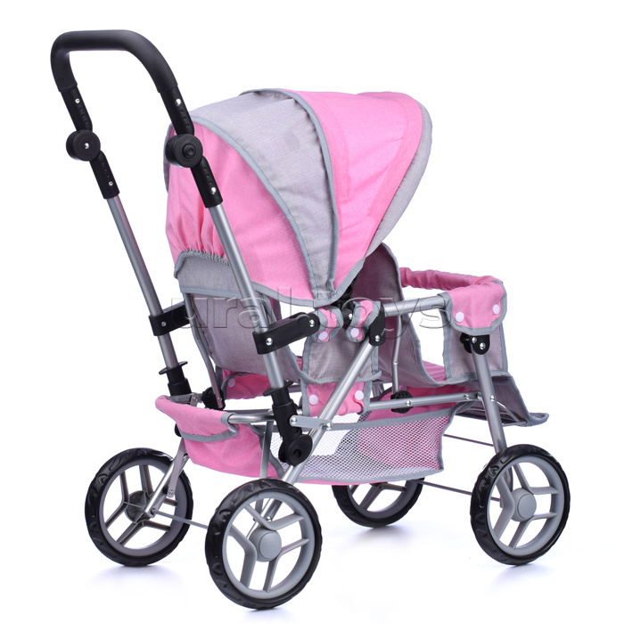 Коляска для кукол для двойни, металлическая, прогулочная, с тентом, с корзиной, цвет серо-розовый